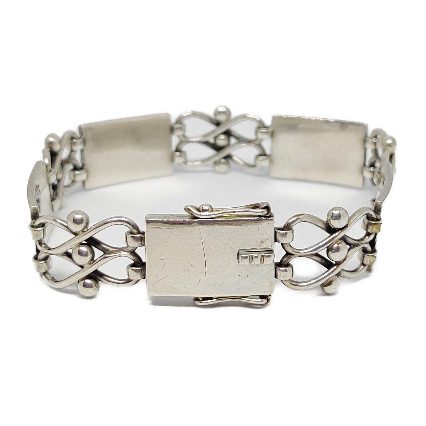 Evald Nielsen; Armbånd i sølv. Leddelt armbånd monteret med kasselås samt to sikkerhedslåse.
