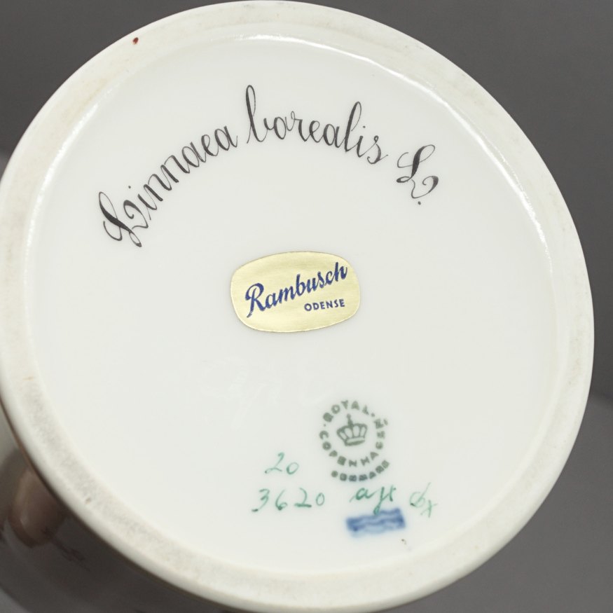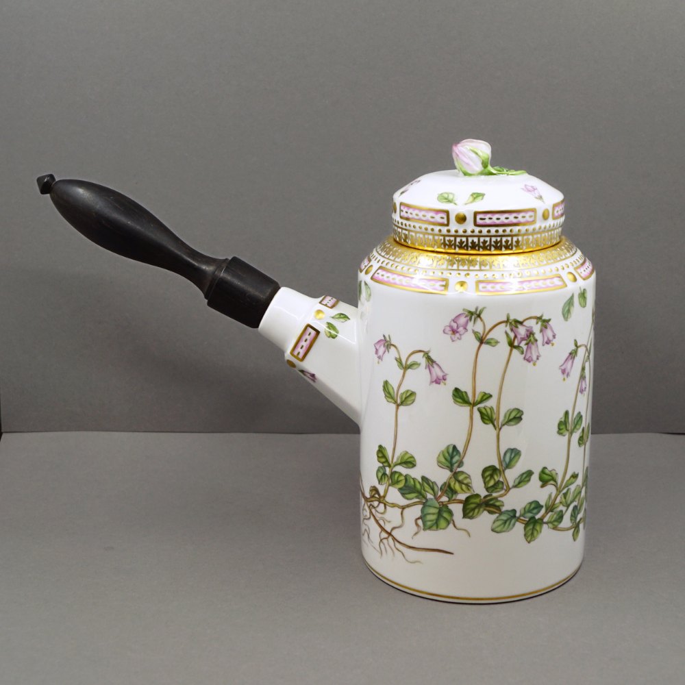 Royal Copenhagen, Flora Danica; Kaffekande af porcelæn #3620 med stjerthank af træ. Dekoration: Linnaea borealis L. (Linnæa).