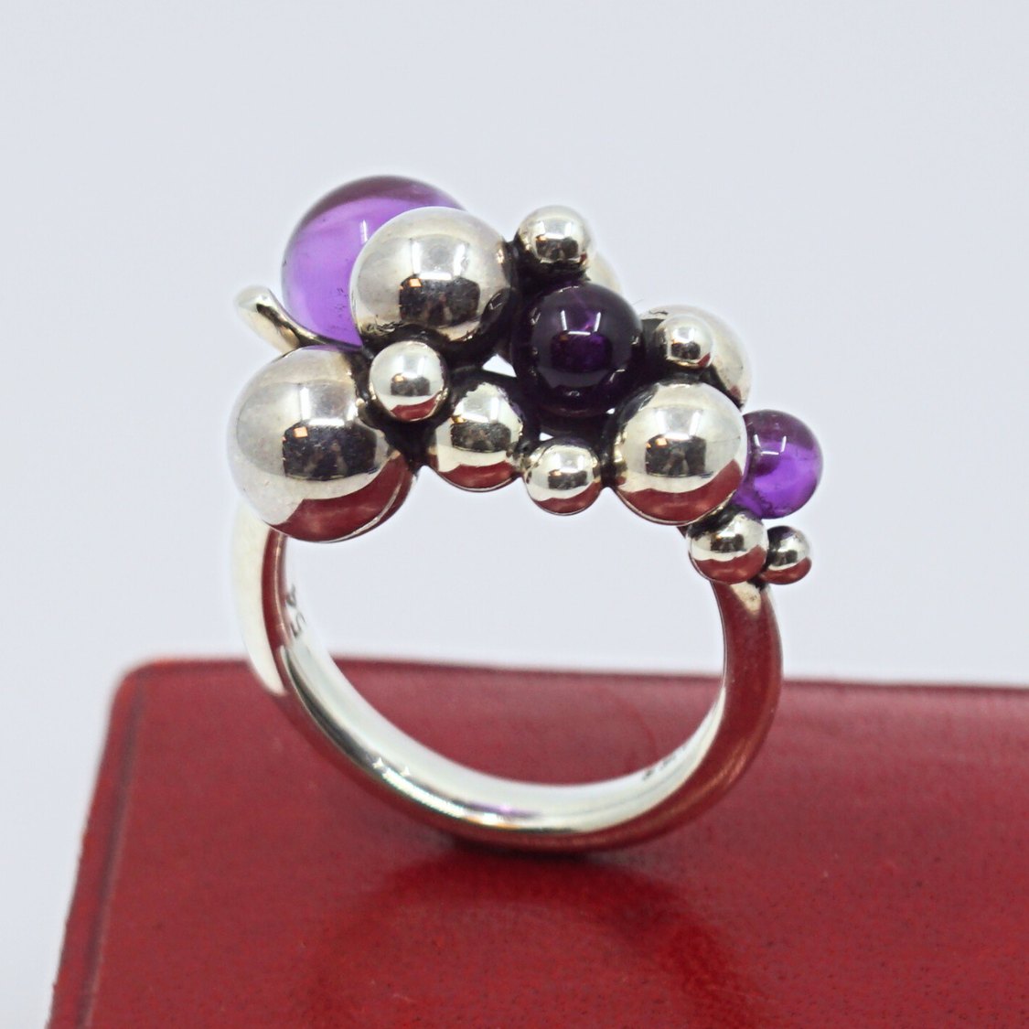 Georg Jensen; Moonlight Grapes ring i sterlingsølv med lilla ametyst kugler. Ring str. 54.