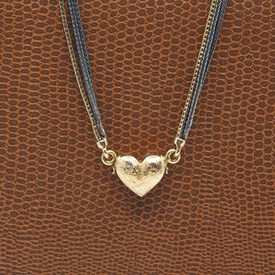 Per Borup; Heart clasp in 14kt gold, including chain of oxidized silver and 14k gold. The heart can be turned both ways and has one side with a smooth surface and one with a rough surface.