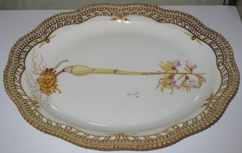 Kgl. Porcelæn Flora Danica Fad for ovalt frugtskål No 3537. Latinsk inskription "Epipogon aphyllum Sw". Måler 36,5cm x 22cm. I perfekt stand.