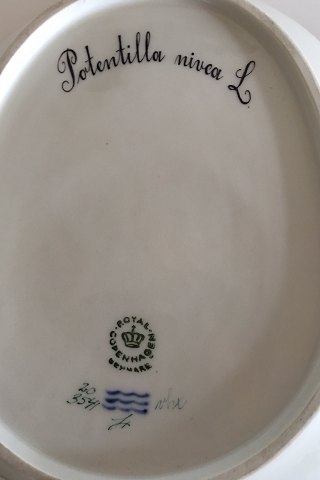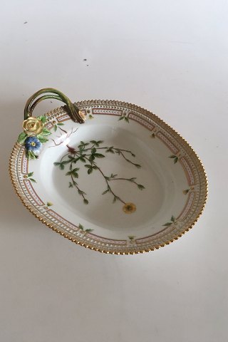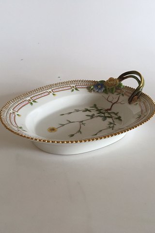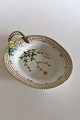 Kongelig Porcelæn Flora Danica Bladformet skål med håndtag 20/3541 nyt nummer 357. Blomsten er: "Potentilla nivea L.". Måler 24,5cm, første sortering og i perfekt stand. Royal Copenhagen