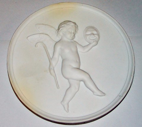 Bing & Grøndahl Biscuit Platte Biscuit Komediens Genius No 100. Kopi fra 1862 efter Thorvaldsens original fra Rom 1838, udført af Pietro Galli. Måler 14,5cm