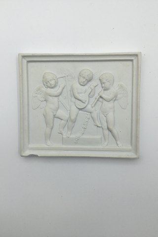 Royal Copenhagen Biscuit Platte Biscuit Spillende Engle No 87. Kopi af O.H.B. Olrik fra 1850 after Thorvaldsens original fra Rom 1833. Måler 12 x 12cm (3.93 x 4.73 inch). Skår i nederste venstre hjørne.