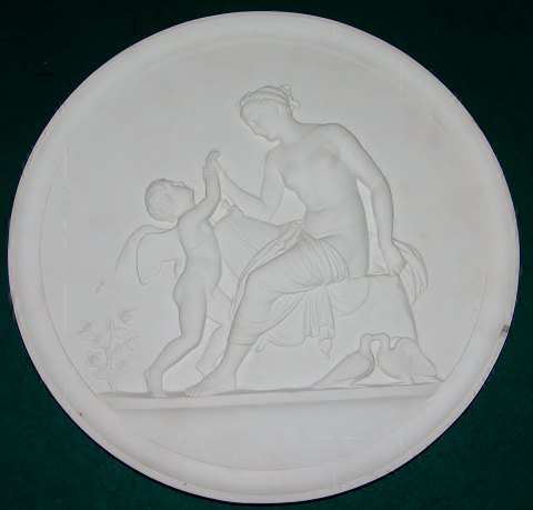 Royal Copenhagen Biscuit Platte Amor Klager til Venus over stikket af en Bi No 84. Kopi fra 1879 af N.G.Henriksen efter Thorvaldsens original fra Rom 1809. Måler 35cm