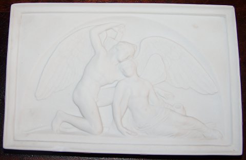 Royal Copenhagen Bisque Plate Amor opvækker den afmægtige Psyche No 78. Copy by Th. Mule 1847 after Thorvaldsens original from Montenero 1810. Measures 15 x 9cm. Has a small chip on the bottom to the left.