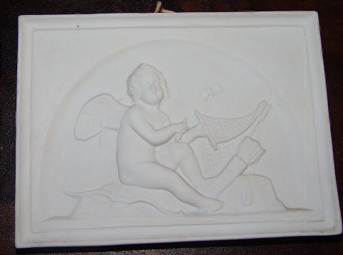 Royal Copenhagen Bisque Plate "Amor works a net" No 82. Copy from 1852 after Thorvaldsens original from Rom 1831. Measures 13,5 x 9,5cm (5.31 x 3.74 inch).