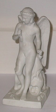 Figur af den triumferende Amor i bisquit. Bertel Thorvaldsen for Bing & Grøndahl ca. 1900. Det yderste af pilen er knækket og staven i venstre hånd mangler. Fabriksmærket på bagsiden af soklen. 15½ cm høj.