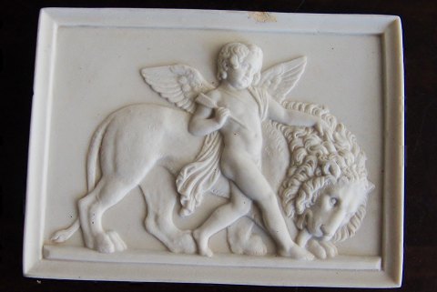 Bing & Grondahl Bisque Plate Amor with the tame Lion No 76. Copy after Thorvaldsens original from Rom 1828. Measures 13,5cm x 10cm.