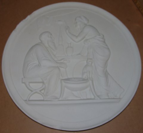 Royal Copenhagen Bisque Plate Elderly and Winter No 119. Copy from 1842-43 by N.G.Henriksen after Thorvaldsens original from Rom 1836. Measures 35cm. Has numerous chips on the rim.