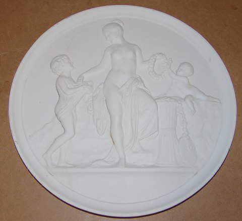 Bing & Grondahl Biscuit Platte Barndom og Forår No 116. Kopi efter Thorvaldsens original fra Rom 1836. Måler 29cm. Har hårrevne, se billede.