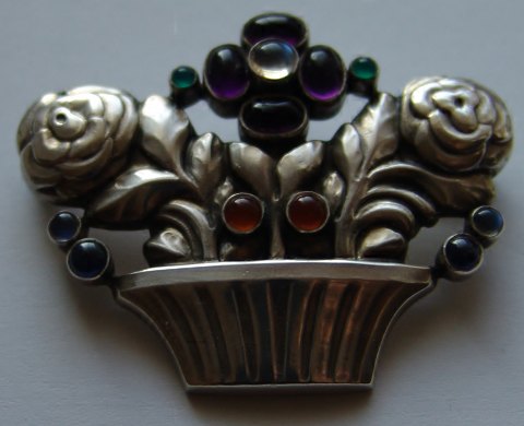 Georg Jensen Broche af sterling sølv, dessin 67, prydet med cabochon ametyster, månesten, grøne agater, citriner og saphirer. Str. 4,3 x 5,5 cm. Stempler efter 1945. I perfekt stand.
