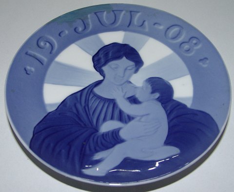 Royal Copenhagen Christmas Plate from 1908. Has a repair, but is otherwise in good condition.
