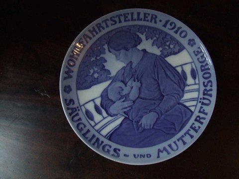 Mother nursing her child. Inscription: WOHLFARTSTELLER 1910 SAUGLINGS UND MUT- TERFÜRSORGE. (welfare plate, baby- and mother care) Comm. by the Grand duchess of Hessen in Germany. Designed by Christian Thomsen. 480 copies. 6.75”