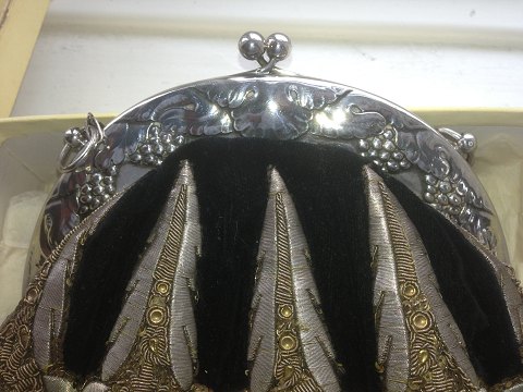 Tidlig Georg Jensen Taske med Sølv Løs og fantastisk broderi No 102. 15,5cm x 22cm og er i god stand. Flot sølv arbejde, men selve taske er fantastisk, med brodering med sølvtråd og andre små sølv ting.