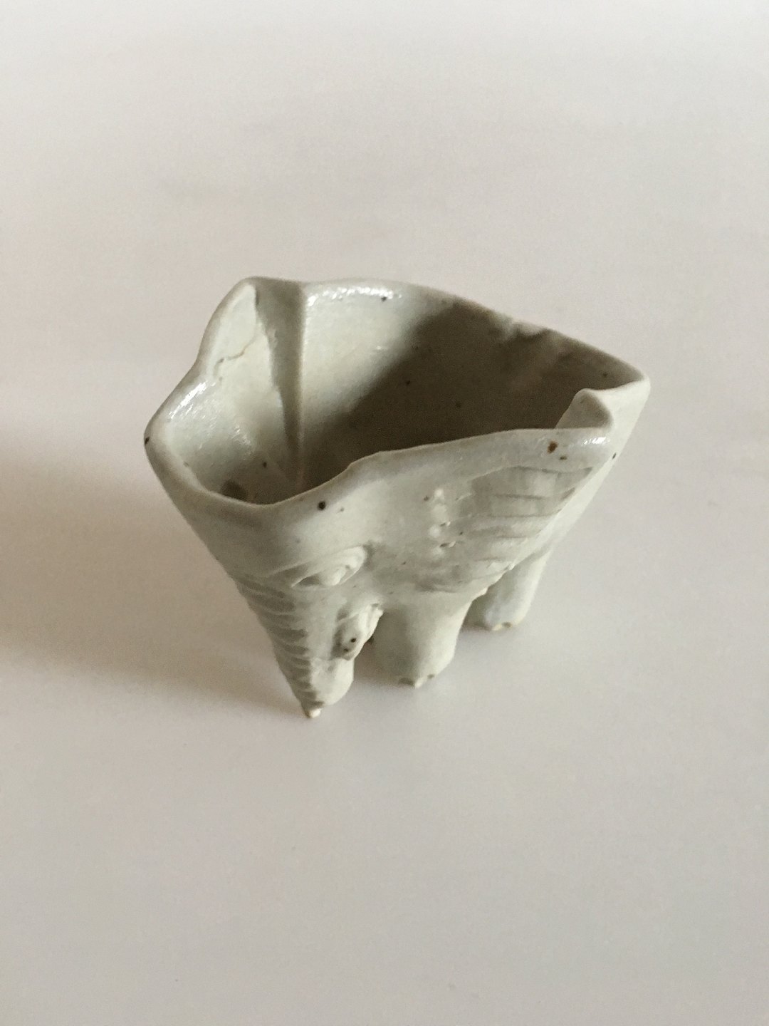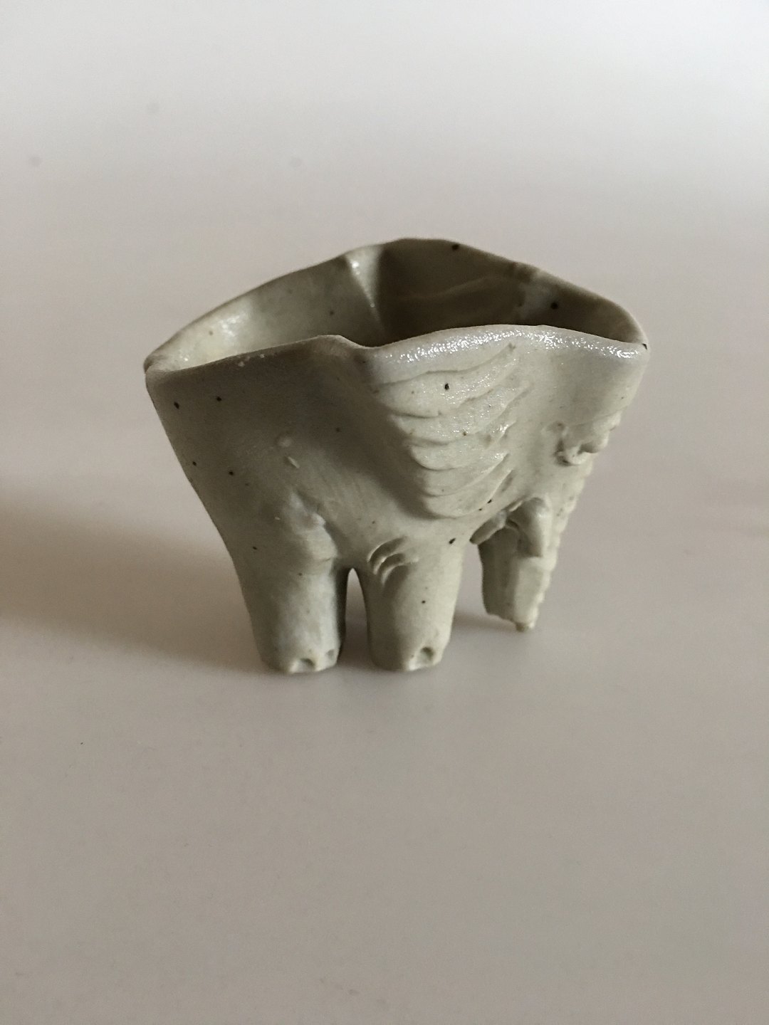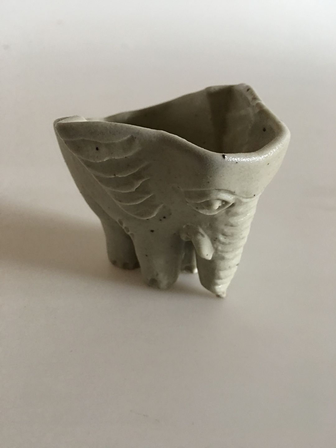 Royal Copenhagen Stoneware Dish in form of Elephant by Jeanne Grut. Signed with the 3 waves and then GV in monogram. Measures 2 1/4" high and 3 1/4". In perfect condition. Not sure what the use for them is. Maybe a jelly/chocolate form, your guess is as good as mine
