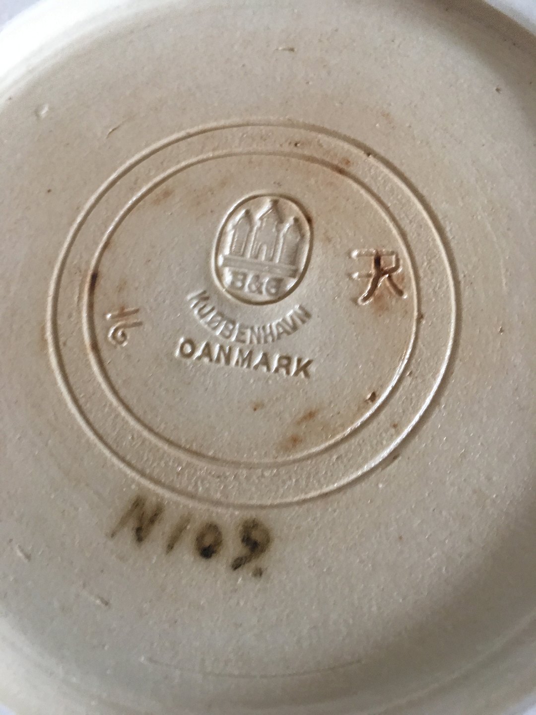 Bing and Grondahl Stoneware celedon unique Dish.Marked with the BG mark, N109, 16 and a monogram APR?. Measures 6" or 15,2cm wide and is in perfect condition.