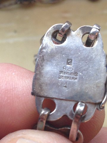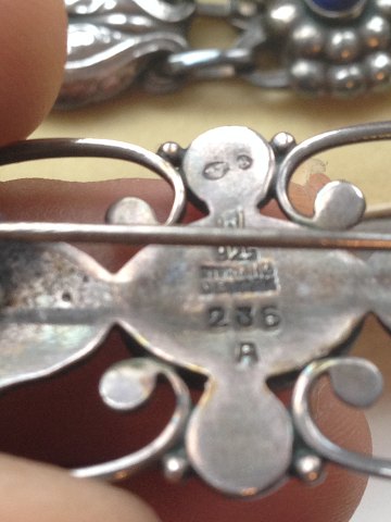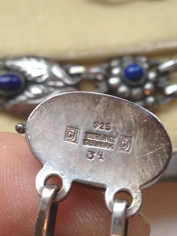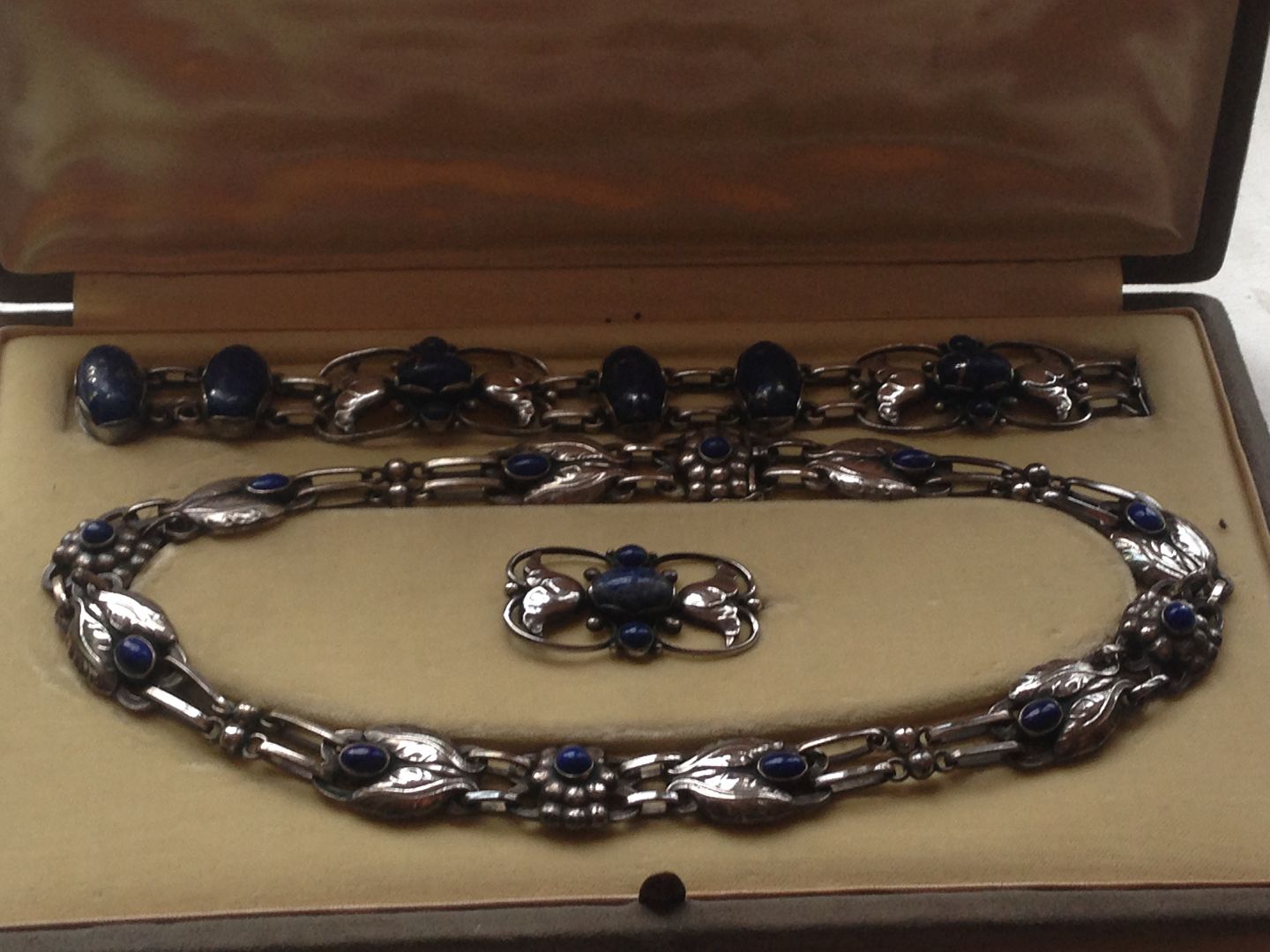 Georg Jensen Sterling Sølv Smykke sæt HalskædeNo 1, Armbånd No 34 og broche No 236A med Lapis Lazuli. I original æske fra Georg Jensen, Stockholm med datering på boksen fra 1941. og alle smykkerne er fra 1933-1944. Så de er nok fra omkring 1941 alle sammen. Æsken i skin er lavet til smykkerne.