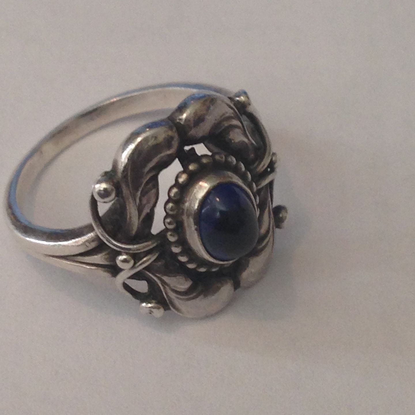 Georg Jensen Sterling Sølv Ring med cabochonslebet synt. blå safir No 39. Ring størrelse er 49. Ringen er fra 1933-1944.