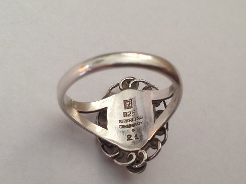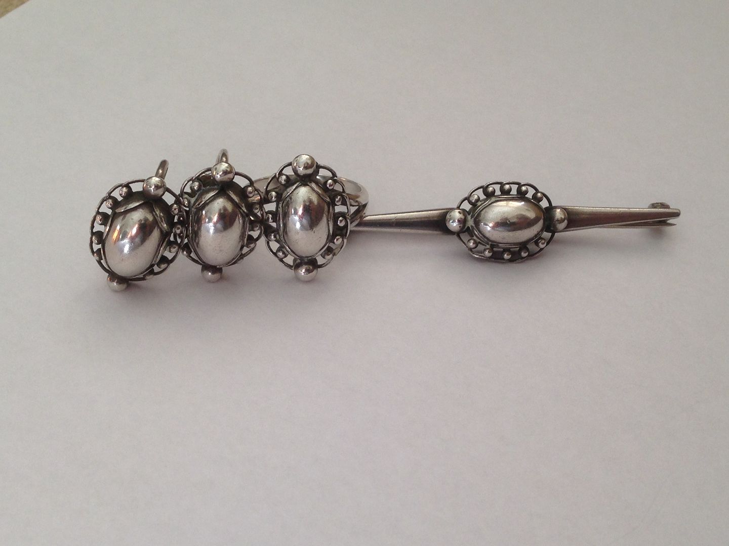 Georg Jensen Sterling Silver Jewelry Set of Ring, brooch and earclips No 21, No 195 and No 81.