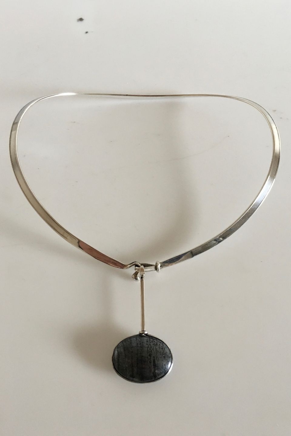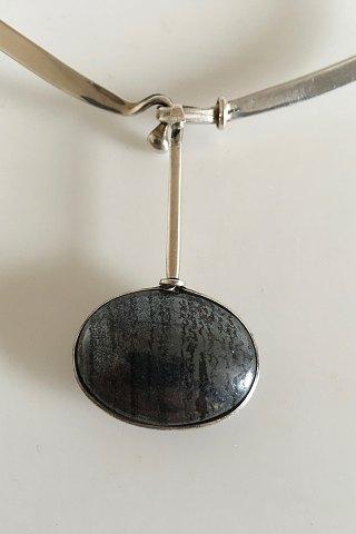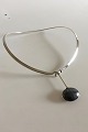 Georg Jensen Sterling Sølv Torun Halsring No 168 med Vedhæng No 129 i Hæmatit Sten. Designet af Vivianna Torun Bülow-Hübe. Halsring måler 16.5 x 13.5 cm i bredden. Vedhæng måler 3.1 x 2.5 cm. Den samlede vægt er 33 g.
