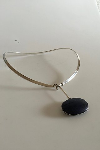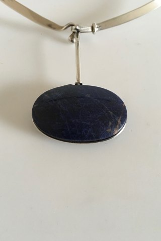 Georg Jensen Sterling Silver Torun Neckring No 168 with Pendant No 133 made of Lapis Lazuli. Designed by Vivianna Torun Bülow-Hübe. Neckring is 16.5 cm / 6 1/2 in. x 13.5 cm / 5 5/16 in. The pendant measures 4.5 cm / 1 49/64 in. x 3 cm / 1 3/16 in. Combined weight is 51 g /1.95 oz.