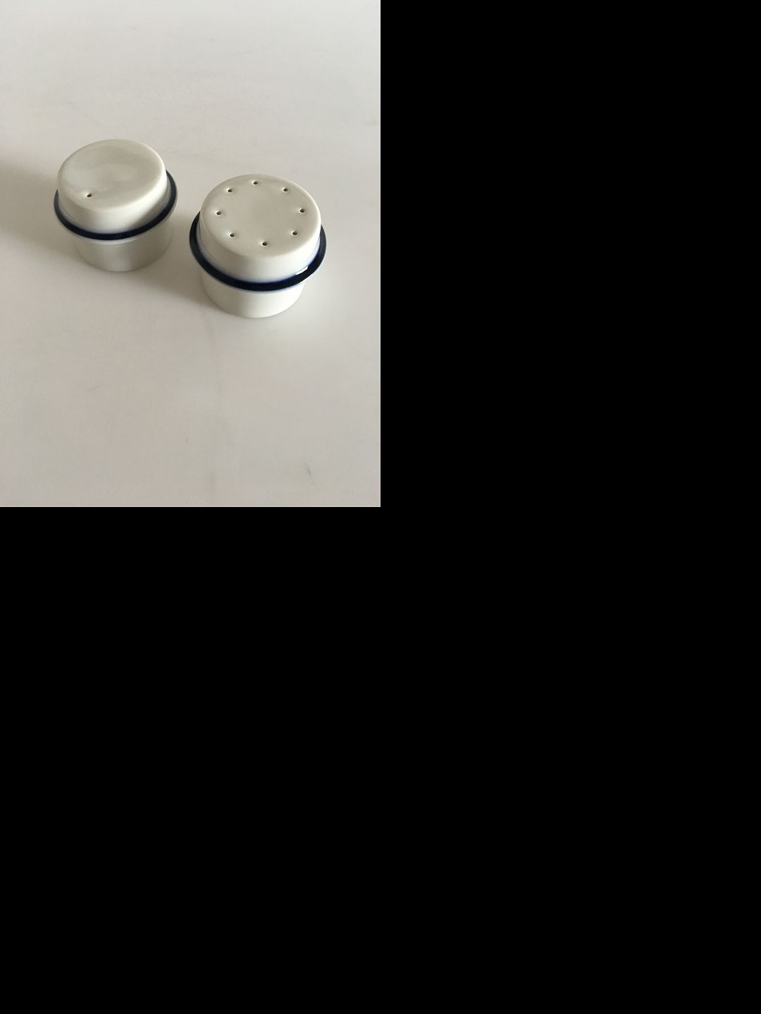 Royal Copenhagen Indigo Salt & Pepper Set No 14915. 4 cm tall (1 37/64"). 5.5 cm dia (2 11/64")