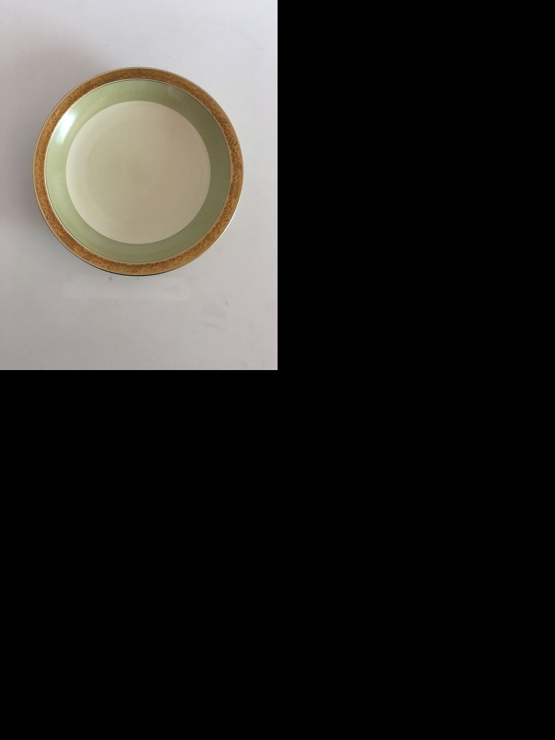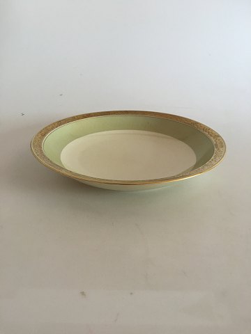 Royal Copenhagen Dagmar Rundt Kagefad No. 9482. 27 cm (10 3/5 in.) Pistaciegrøn og cremefarvet stel med guldkant designet af Thorkild Olsen i 1930'erne.