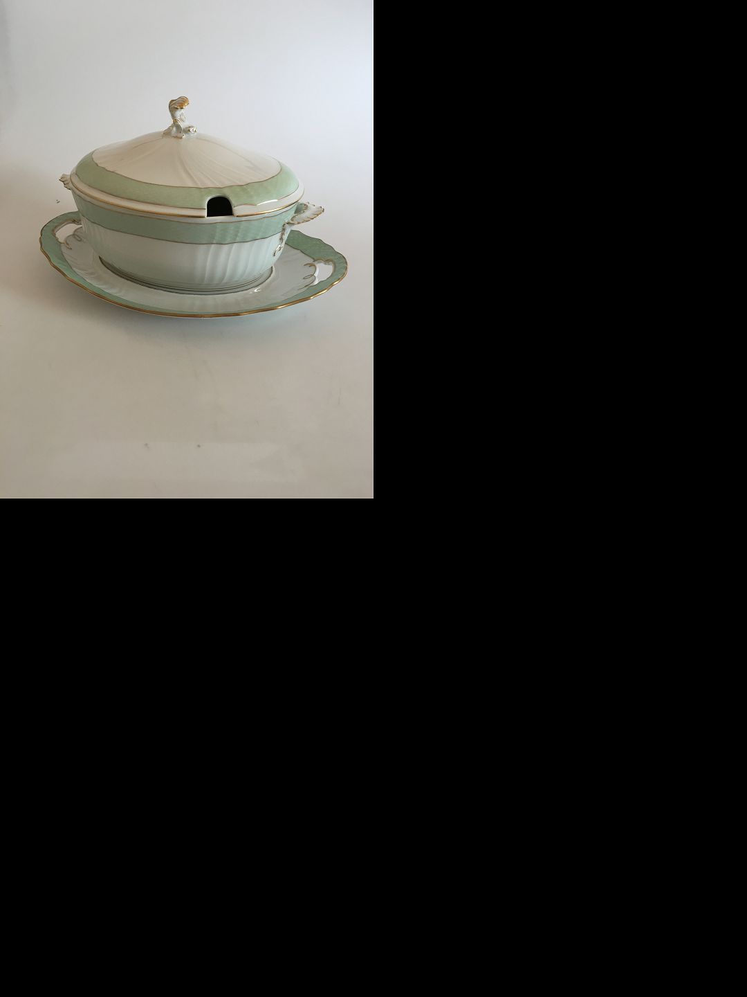 Royal Copenhagen Grøn Svejfet med Guld Terrin No 1666 med Underfad No 1671. Fad måler 37 cm. Terrinet måler 26 x 9.5 cm