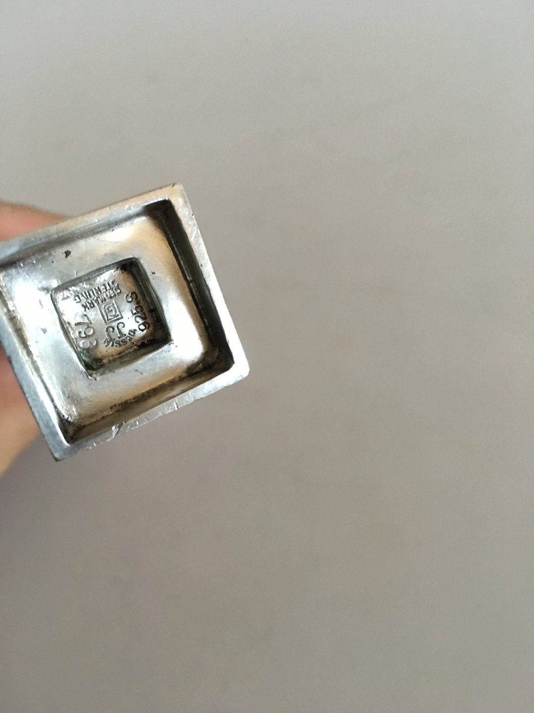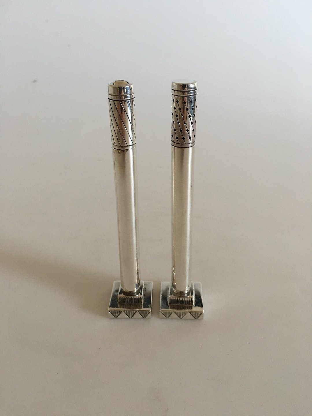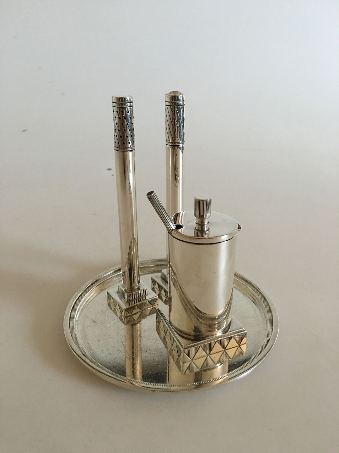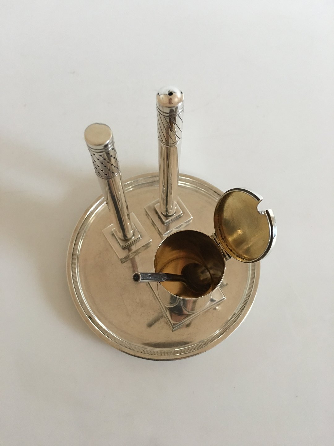 Georg Jensen Sterling Silver Jorgen Jensen Cruet Set No793. Gilded on the inside Mustard Jar with Spoon No793. Tray No793. Salt and Pepper Set No793. The salt and pepper set and the tray are with marks from 1932-1945. Combined weight 279 g (9.85 oz).