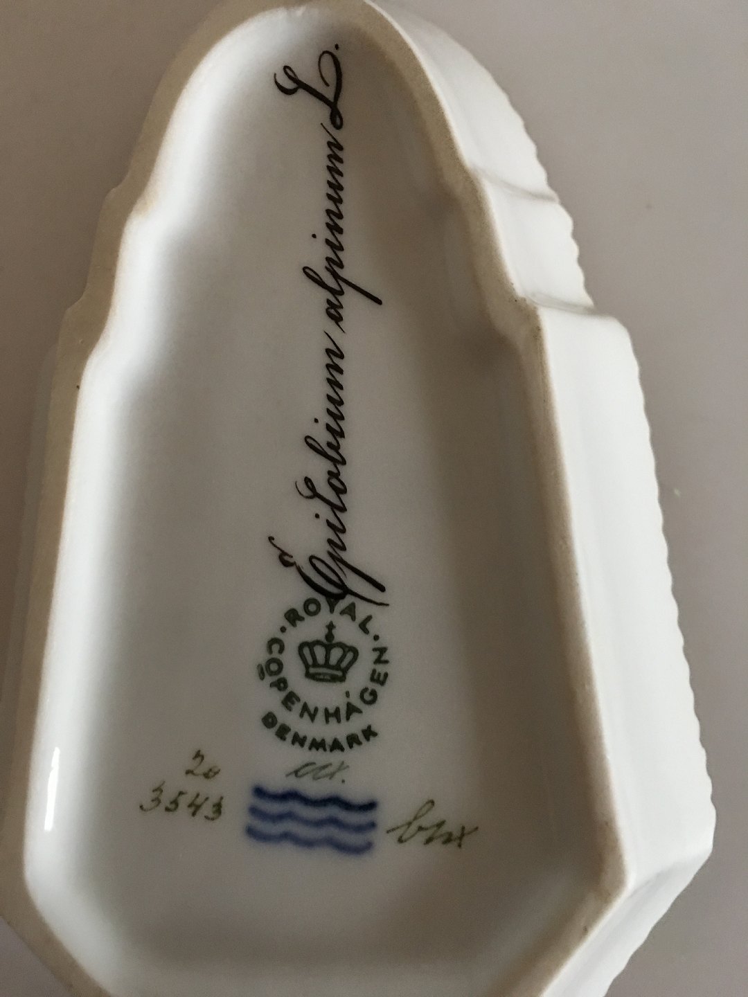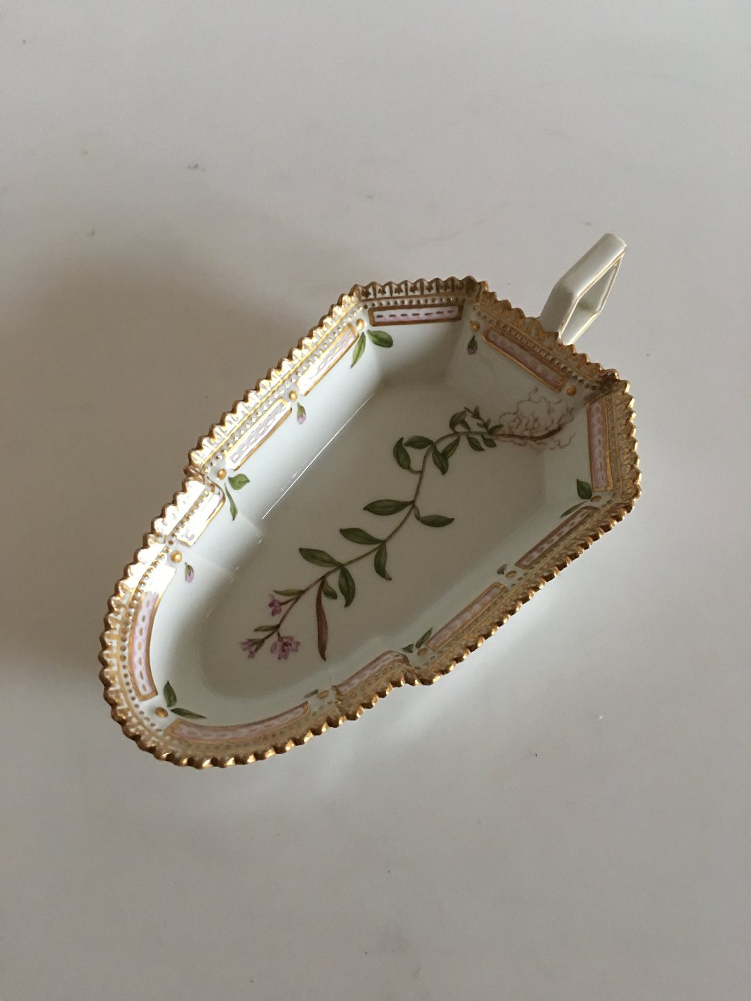 Flora Danica Pickle Dish with Handle No 20/3543. Latin Name: Epilobium Alpinum 15 cm L (5 29/32"). In perfect condition.