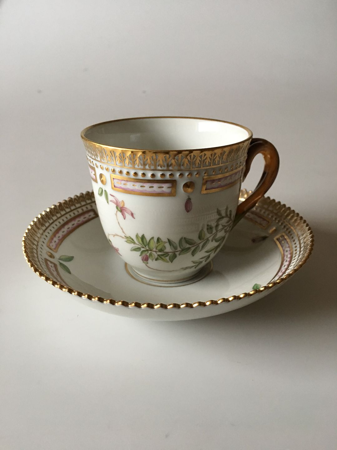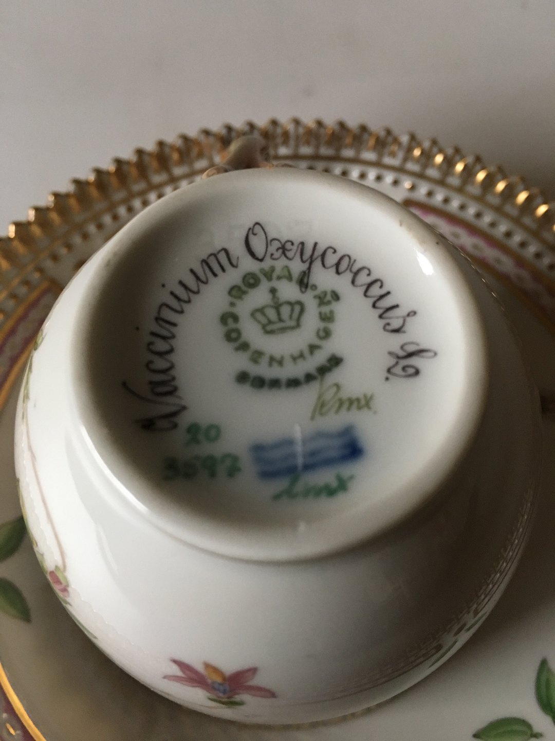 Royal Copenhagen Flora Danica Kaffekop og Underkop No 20/3597. Latinsk Navn: Vaccinium Oxycoccus (Alm. Tranebær). 2. Sort. I fin hel stand. 7 x 7 cm