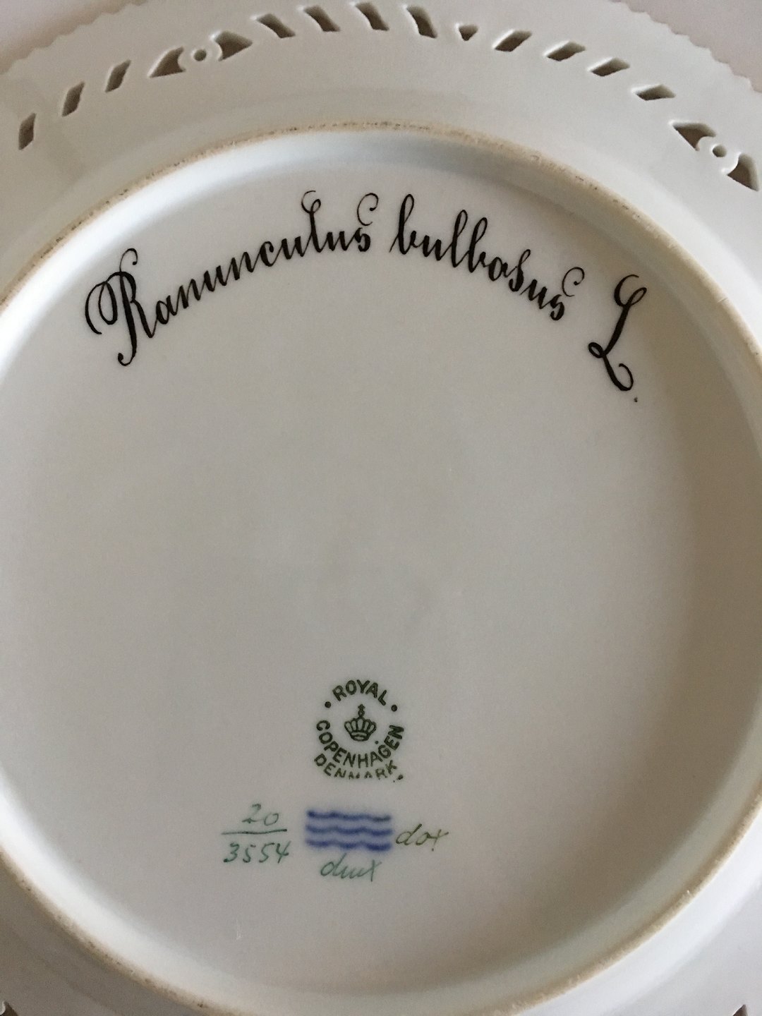 Royal Copenhagen Flora Danica Frokost Tallerken med Gennembrudt Kant No 3554. Latinsk Navn: Ranunculus Bulbosus. 23 cm. 1 Sort. I perfekt stand.