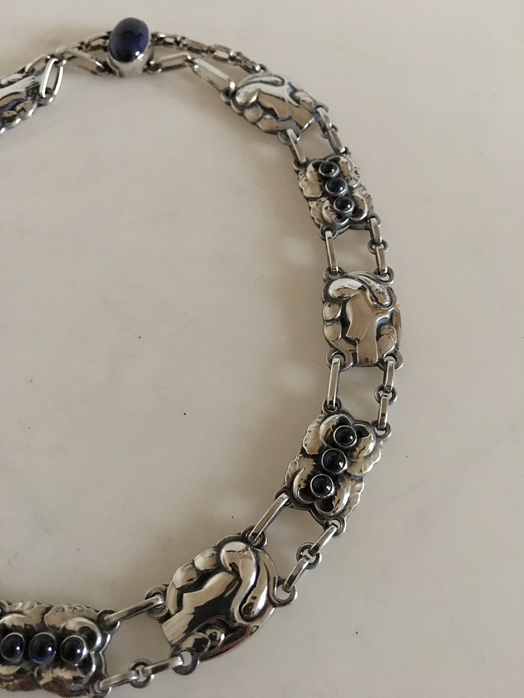 Georg Jensen Sterling Sølv Halskæde No 16 med Syntetisk Safir. 38.5 cm L. Vejer 50 gram. Fra efter 1945.