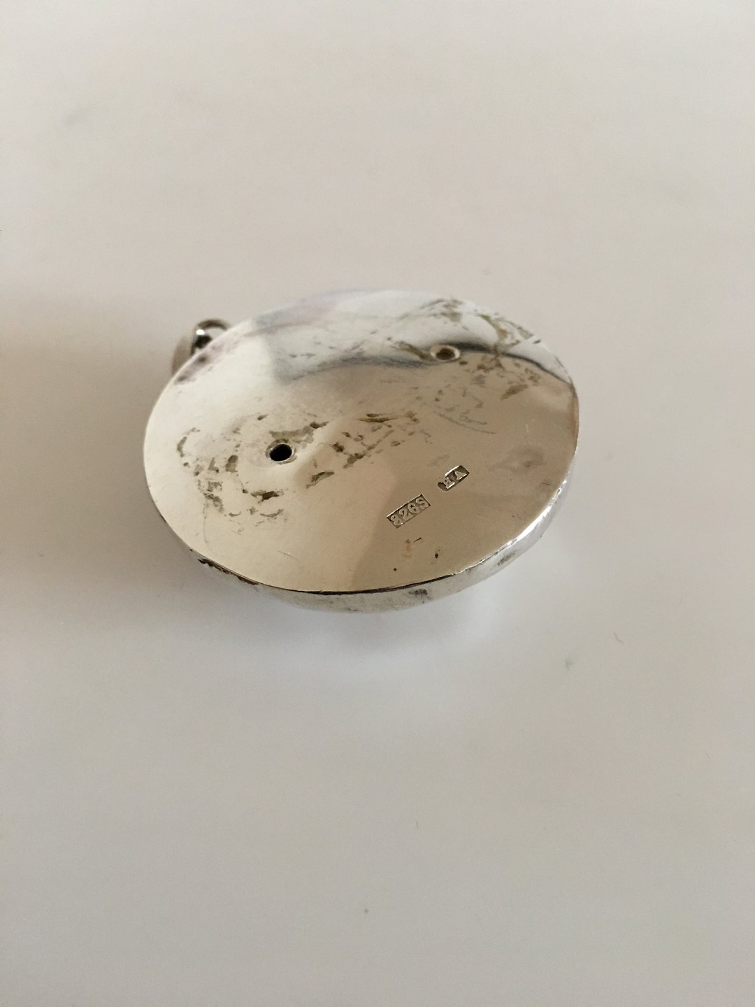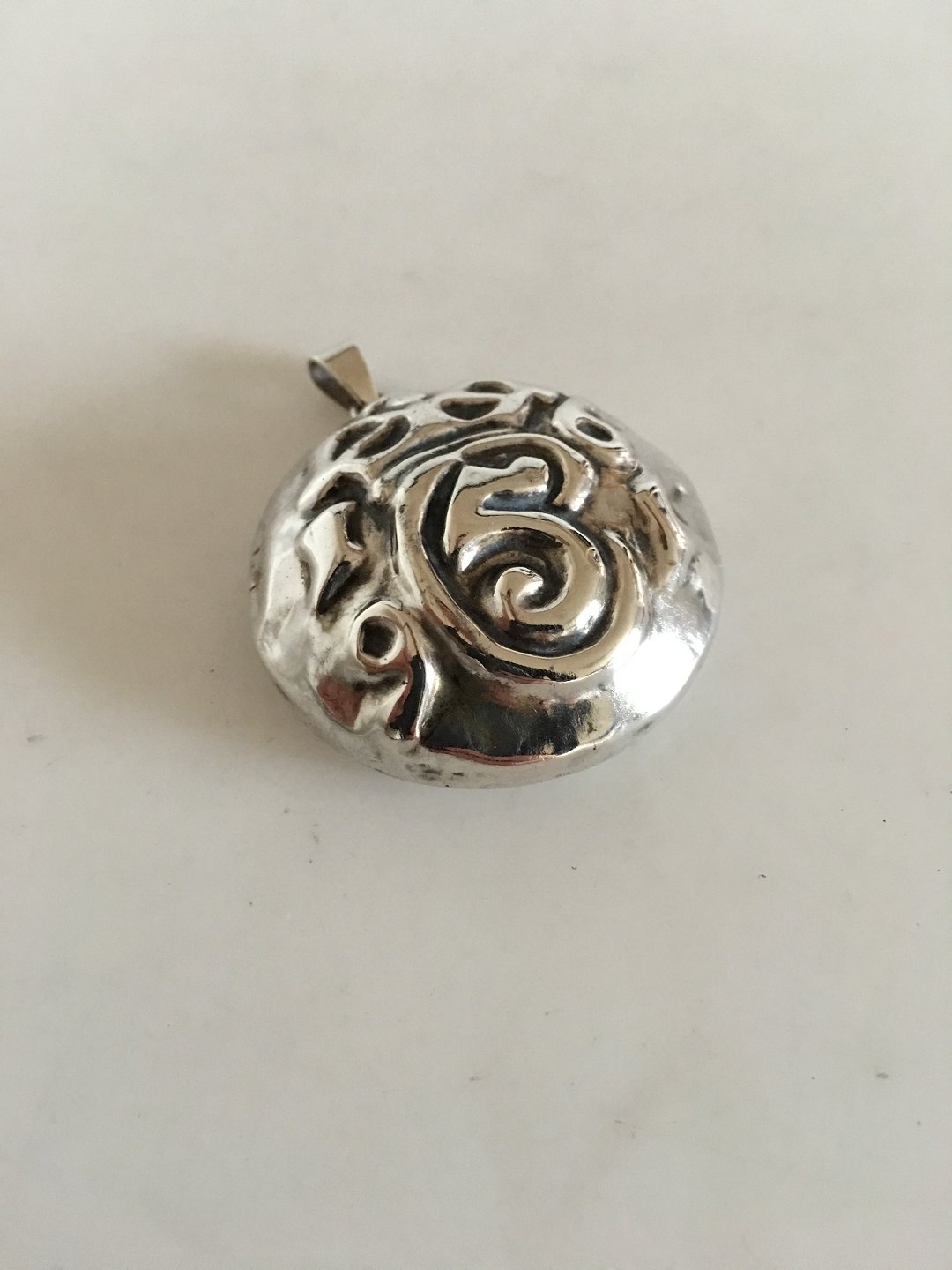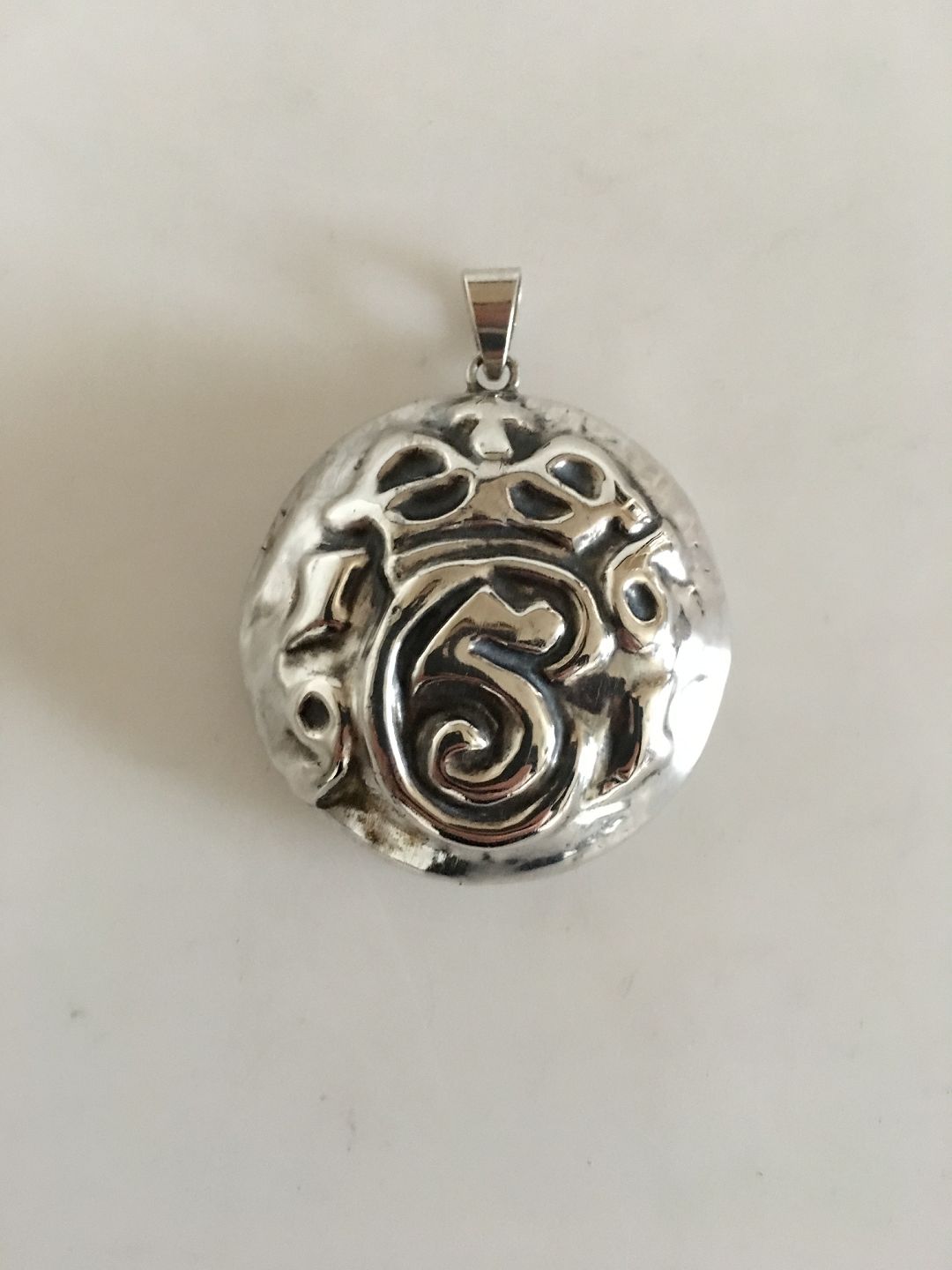 Sølvvedhæng med Christian 5. Monogram / Navnetræk. Måler 4.5 cm Ø. Vejer 12 gram. Lavet af Sølvsmeden H. Andreasen efter model skabt ud fra kraftige jernnagler der har siddet i portene på Kronborg Slot i Helsingør.
