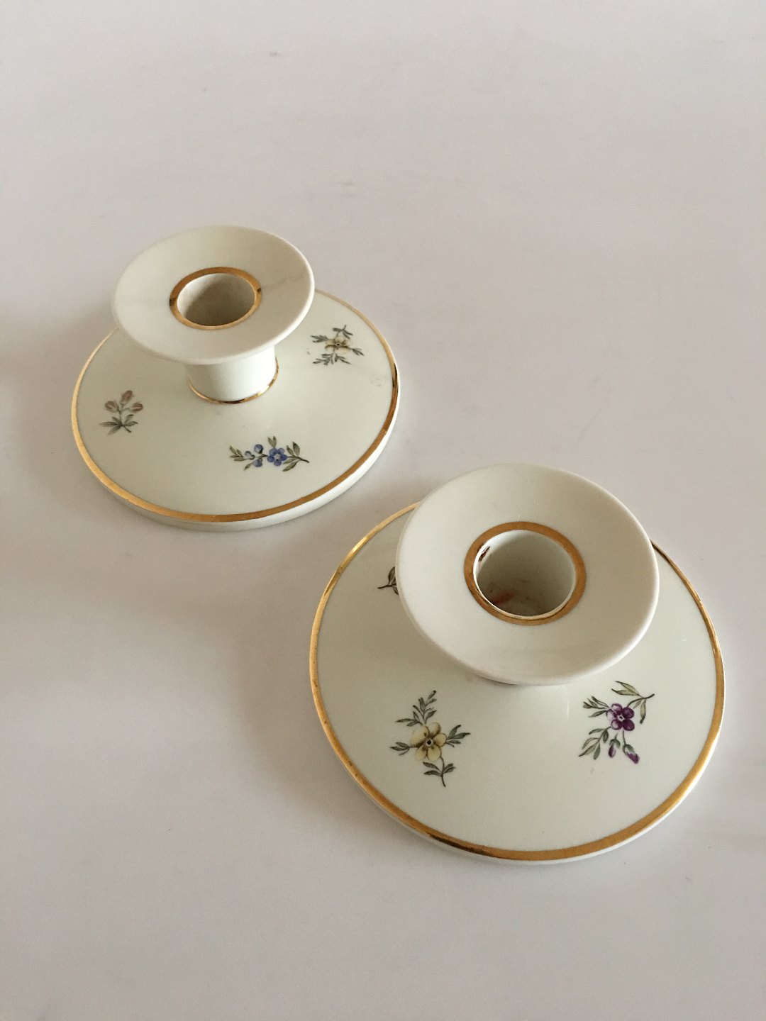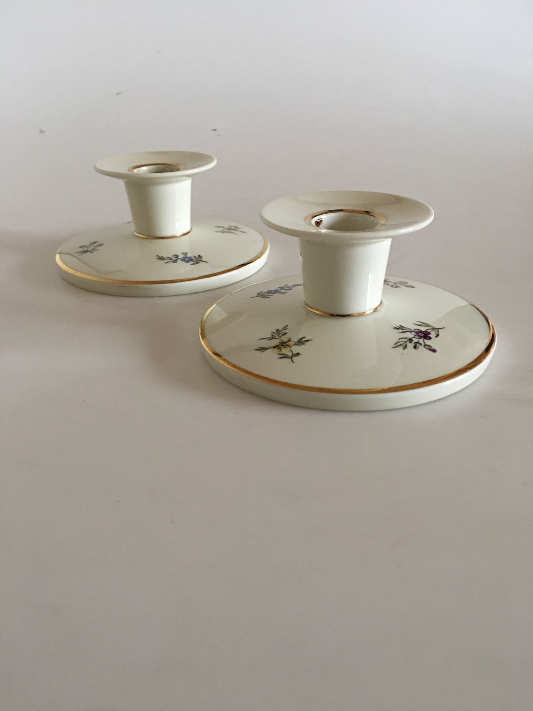 Royal Copenhagen Frijsenborg Candlesticks No 3335. 6 cm Tall. 11.5 cm dia. In perfect condition. Creme colored with flower motifs named after the nobel county of Frijsenborg