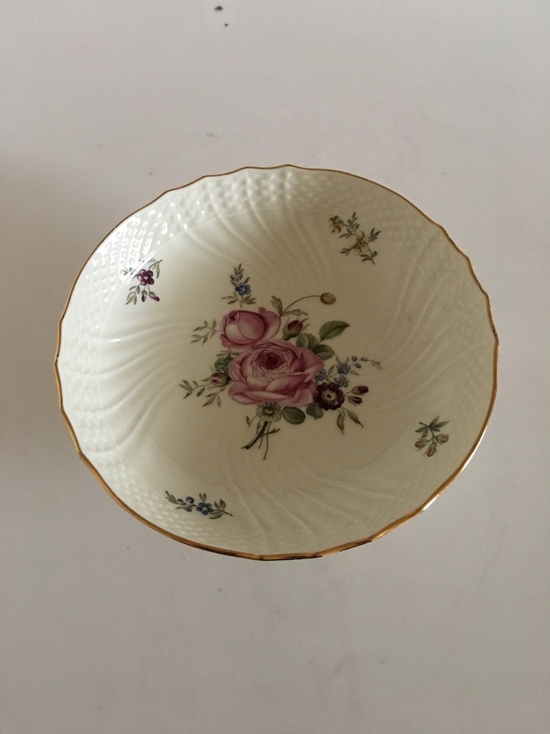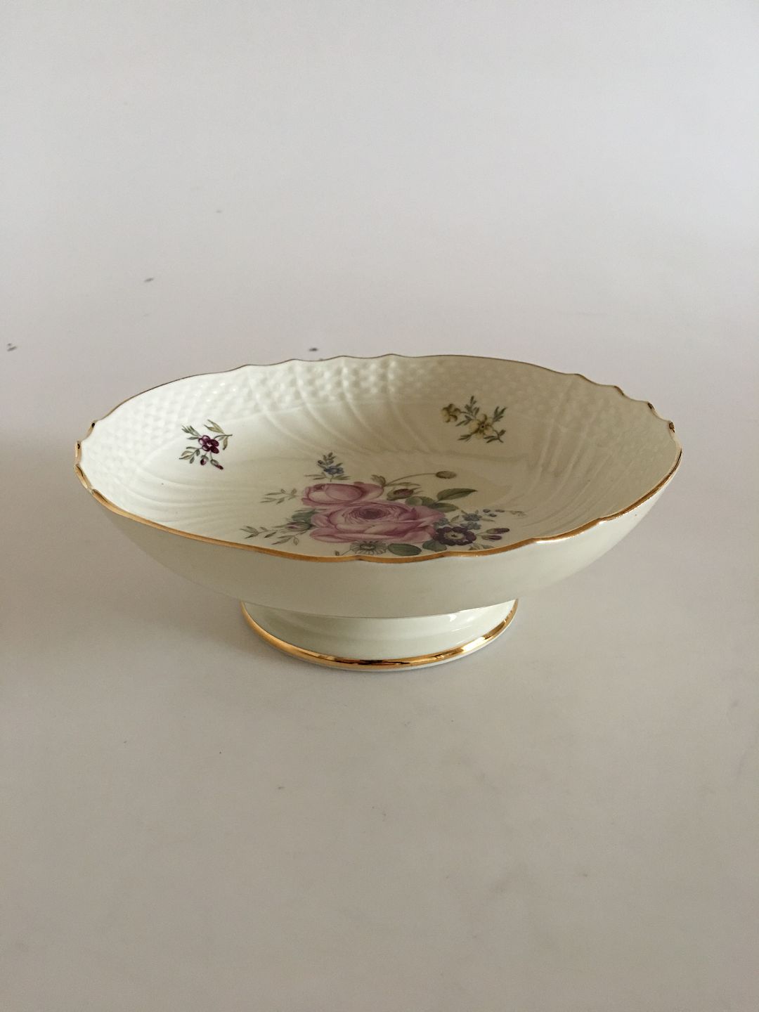 Royal Copenhagen Frijsenborg Cake Bowl on Short Foot No 1532. 17.5 cm dia. 6 cm H. In perfect condition. Creme colored with flower motifs named after the nobel county of Frijsenborg
