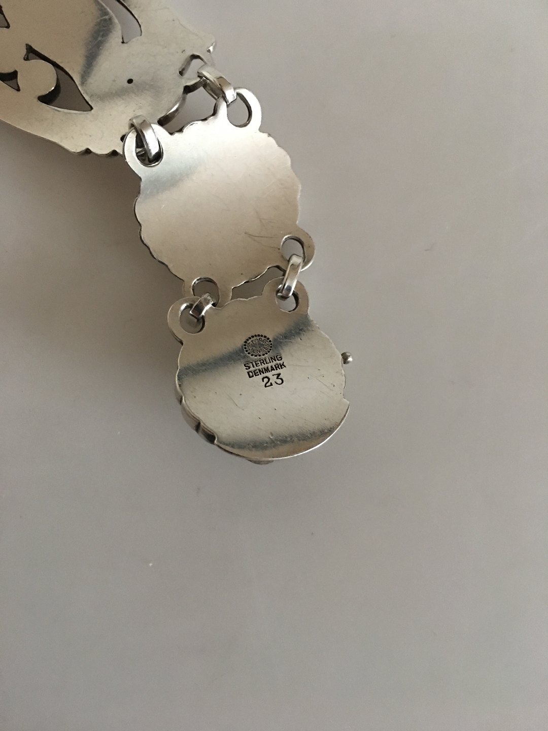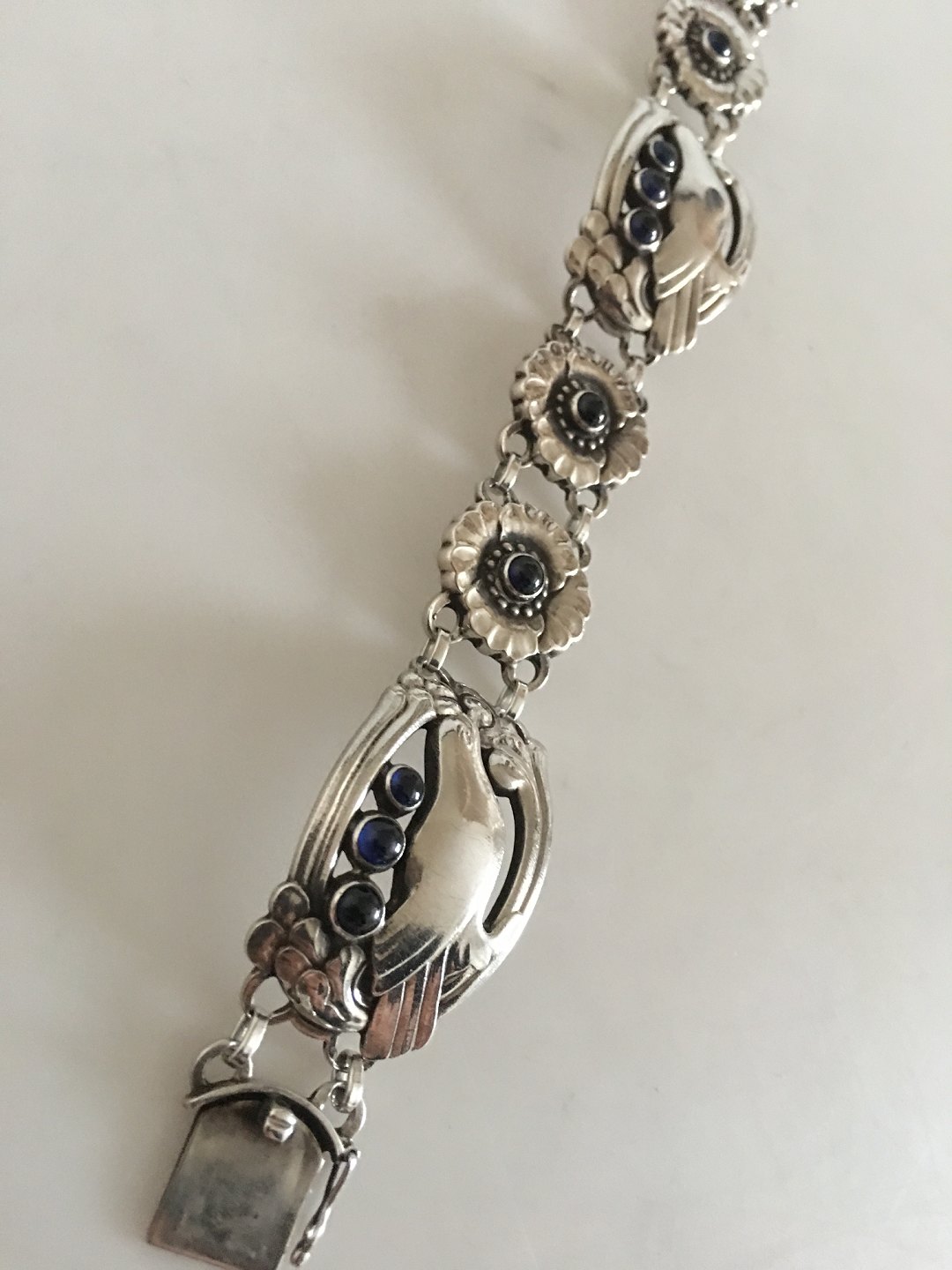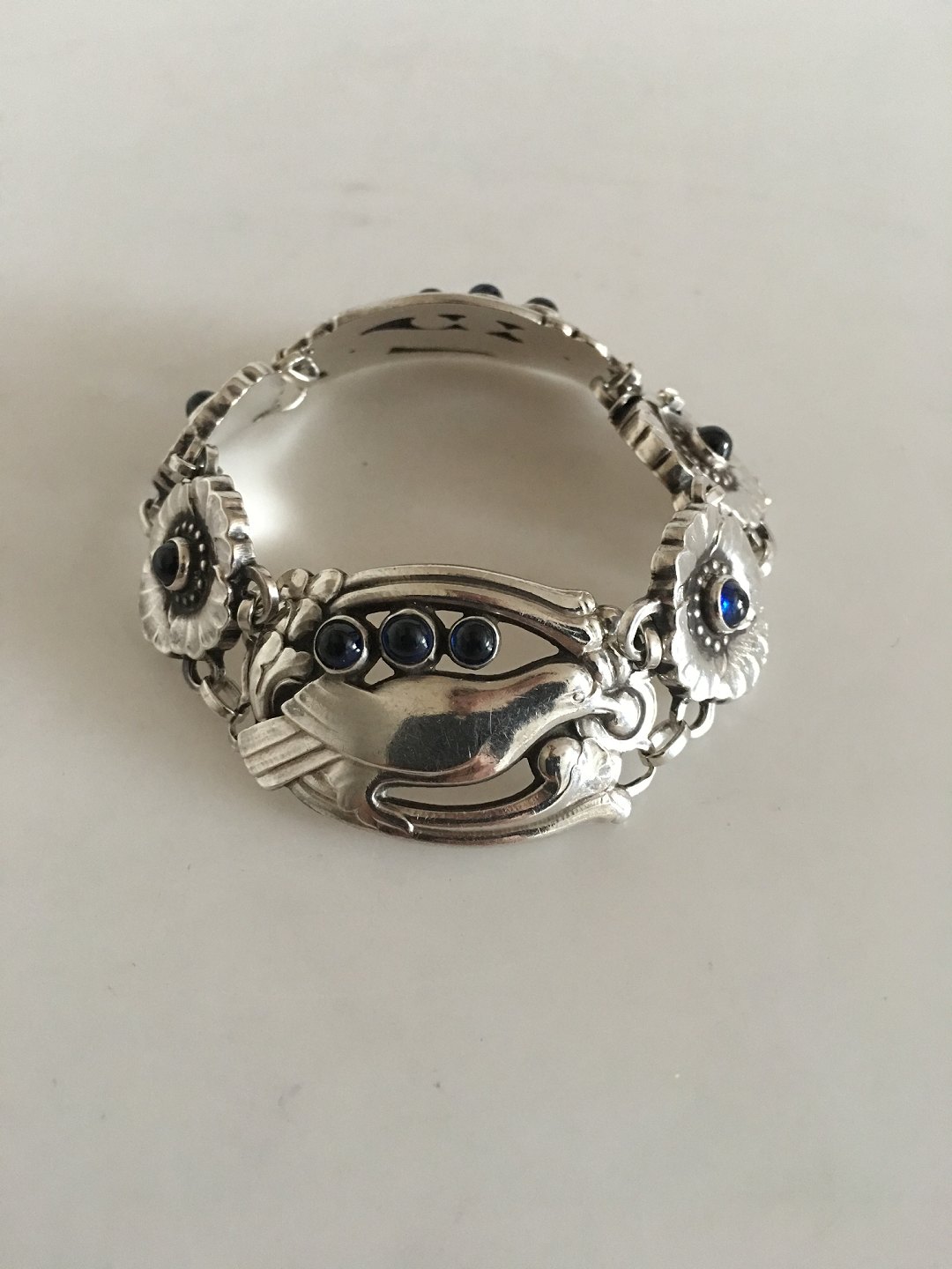 Georg Jensen Sterling Sølv Armbånd No 23 med Fugle og 10 Syntetiske Safirer. Måler 18 cm. Vejer 39 gram. Fra efter 1945. I flot stand.