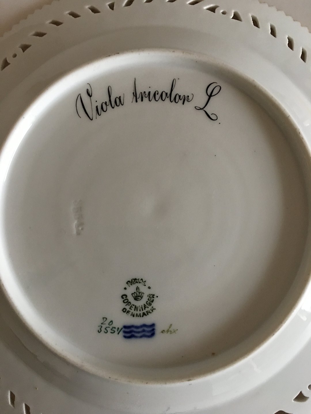 Royal Copenhagen Flora Danica Gennembrudt Frokosttallerken No 20/3554. 23 cm �. Latinsk Navn: Viola Tricolor (Alm. Stedmoderblomst) med gamle stempler fra 1923-1934.