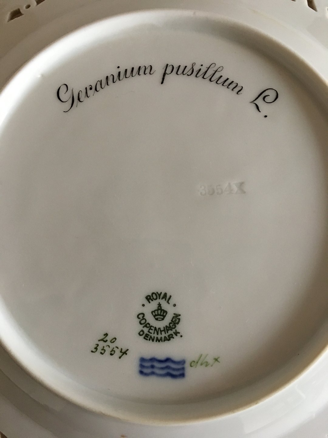 Royal Copenhagen Flora Danica Pierced Luncheon Plate No 20/3554. 23 cm (9 1/16"). 1st Quality. Latin Name: Geranium Pusillum. With old marks from 1923-1934.