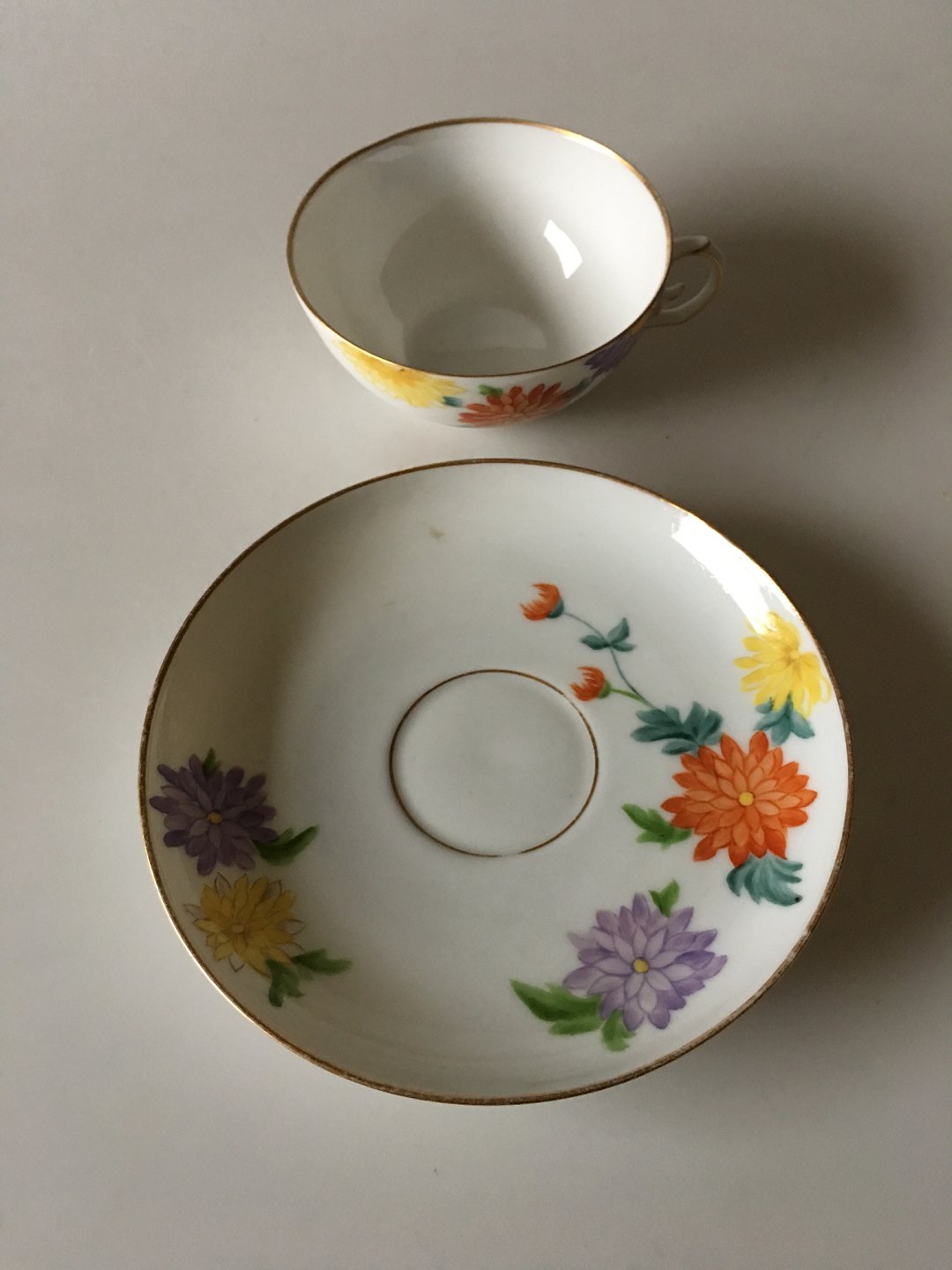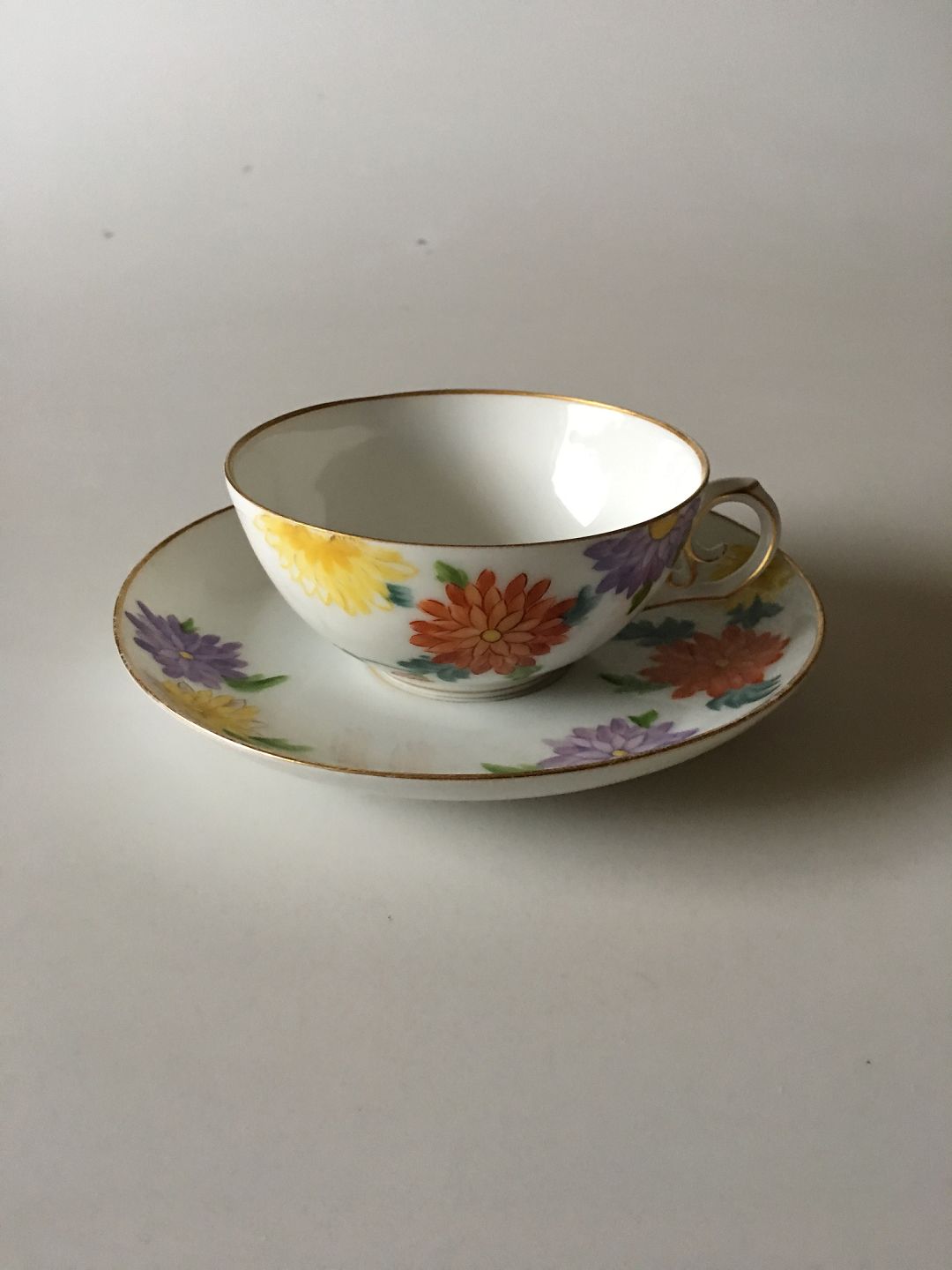 Royal Copenhagen No 93 Teacup and Saucer with Flowers and Gold (Not half laced). In good whole condition. Teacup measures 10 cm dia (3 15/16"). Rare dinner service from 1894-1898. Handpainted