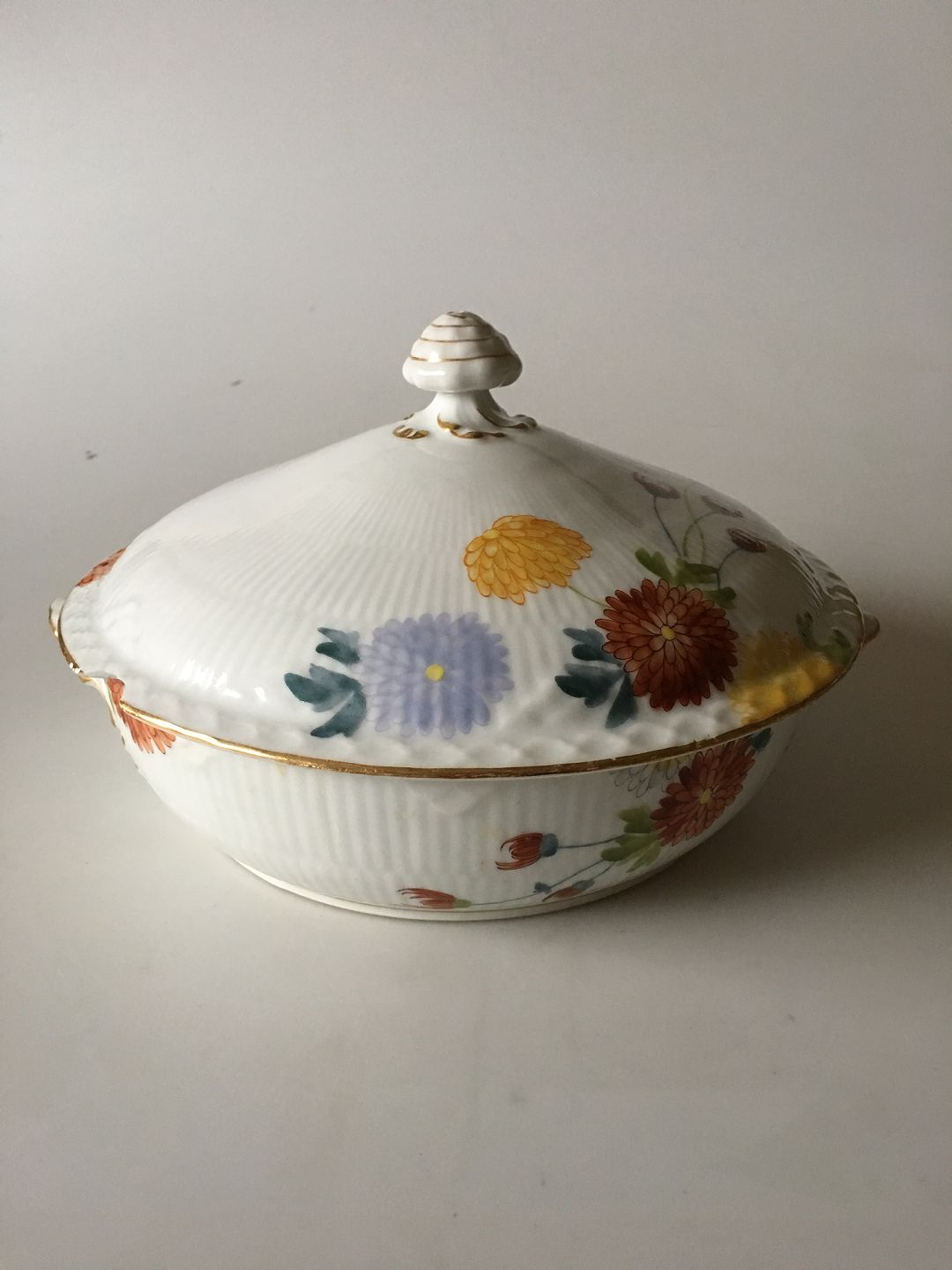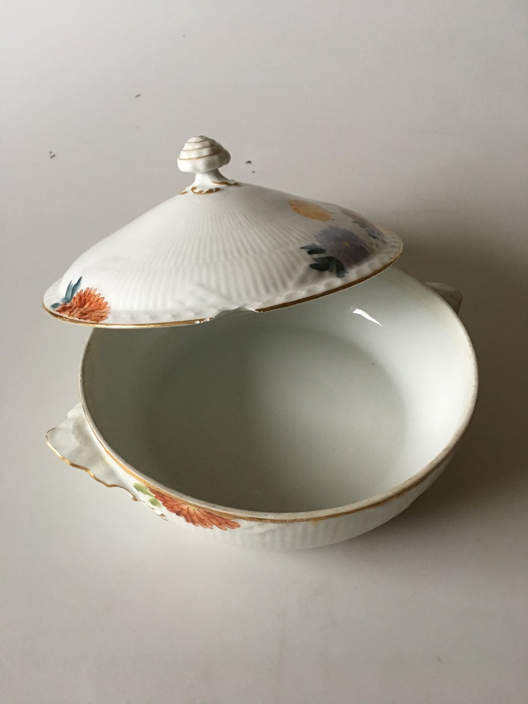 Royal Copenhagen No 93 White Half Lace w. Flowers and Gold Lidded Serving Dish. 20 cm dia (7 7/8"), 6 cm H (2 23/64"). The lid has a large chip, look at picture. There is some wear to the gold. Rare dinner service dated 1894-1898.