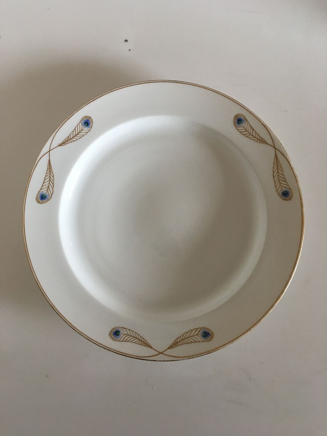 Royal Copenhagen No 118 Round Serving Tray w. Golden Peacock Feather Ornament. 35.5 cm dia (13 31/32") In nice whole condition. The gold looks nice, but has some wear to it. Antique and Rare Royal Copenhagen Dinner Service.