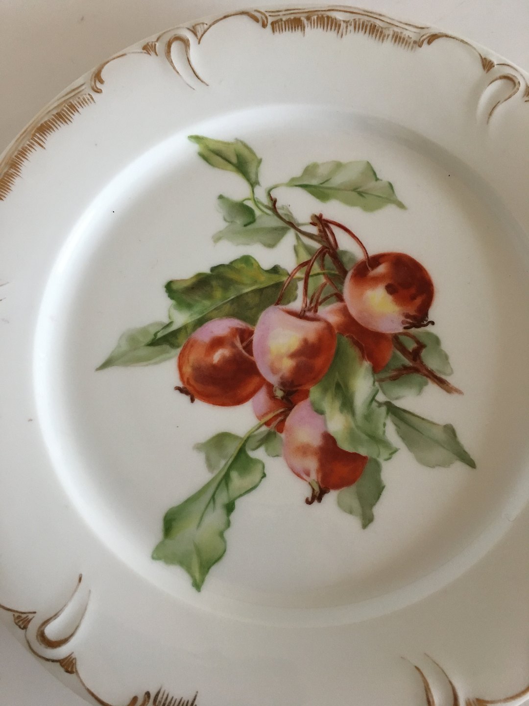 Royal Copenhagen Plate with Handpainted Fruit Motif and Goldornament. 23 cm dia (9 1/16"). In nice whole condition, with some wear to the gold. 2nd Quality