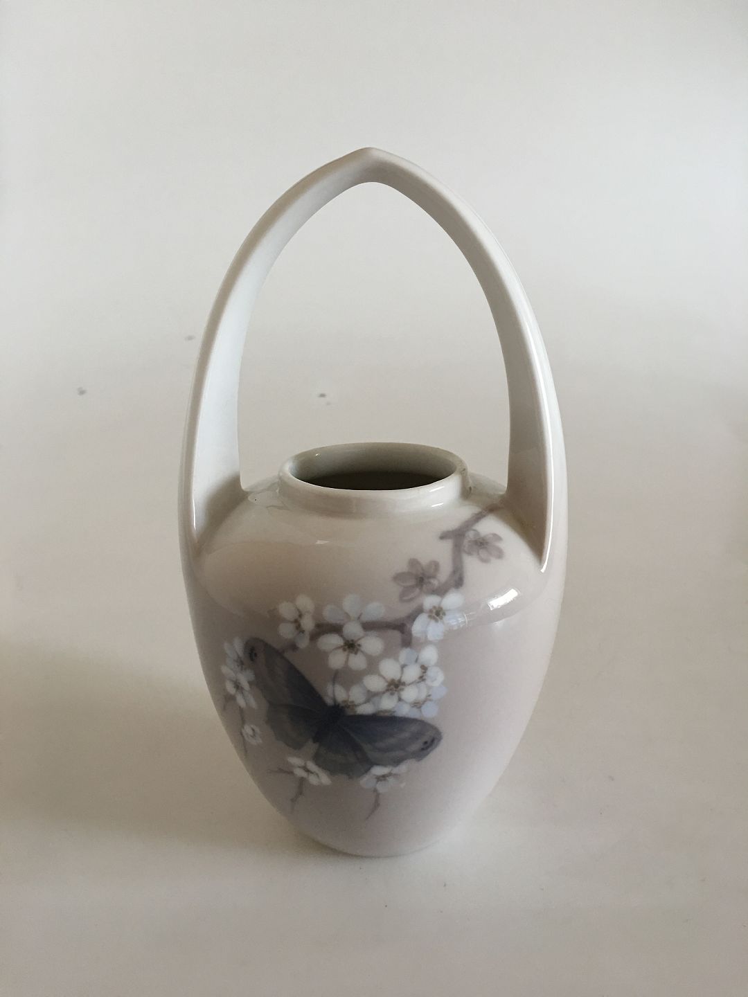 Royal Copenhagen Art Nouveau Vase with Handle No 1528/29. With flower and Butterfly Motif. 19 cm H (7 31/64"). In nice whole condition. 1st Quality.