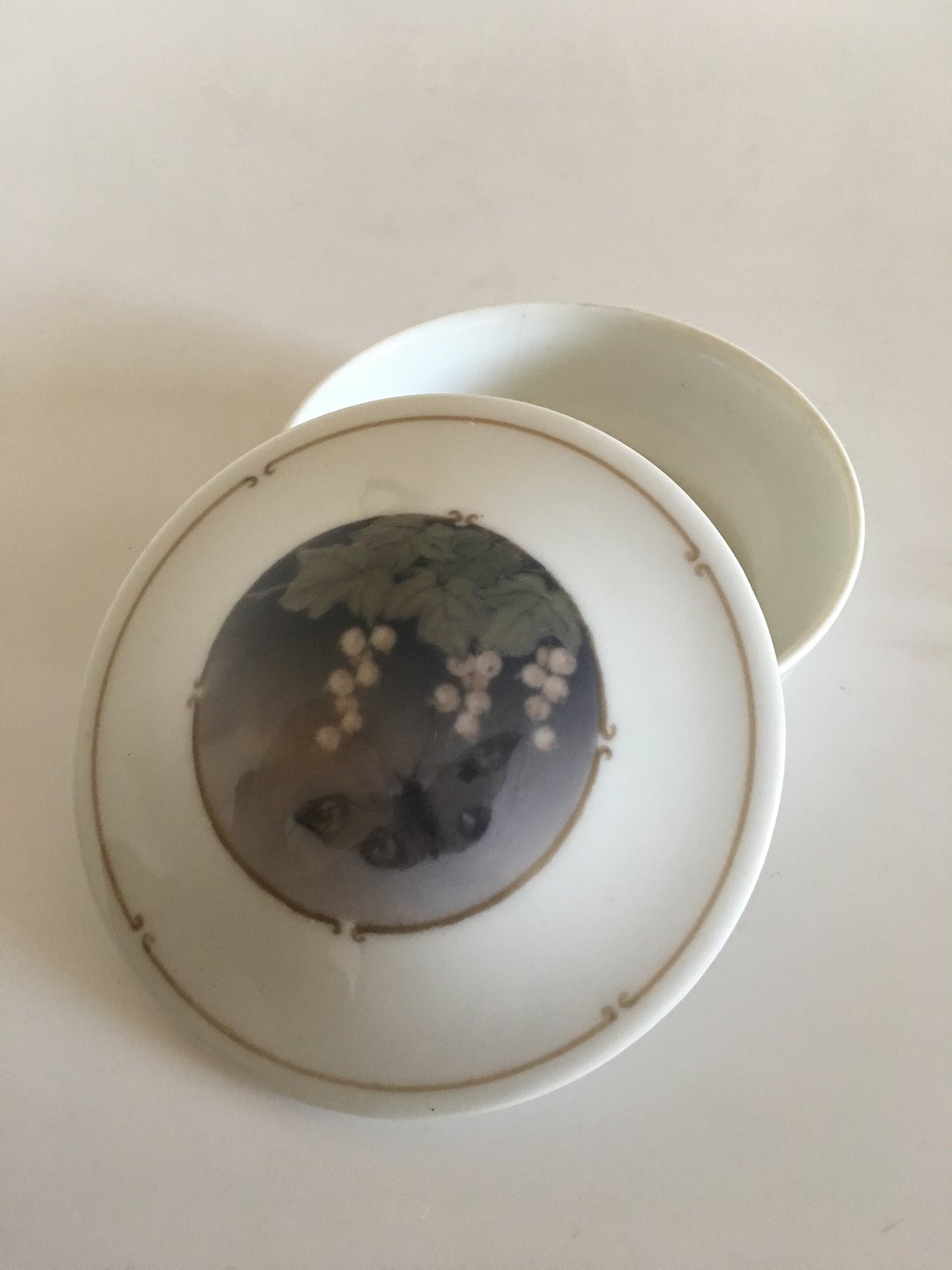 Royal Copenhagen Art Nouveau Lidded Bowl with Berry and Butterfly Motif No 1341/2". 3.5 cm H (1 3/8"). 10.5 cm dia (4 9/64"). 1st Quality. In perfect condition.