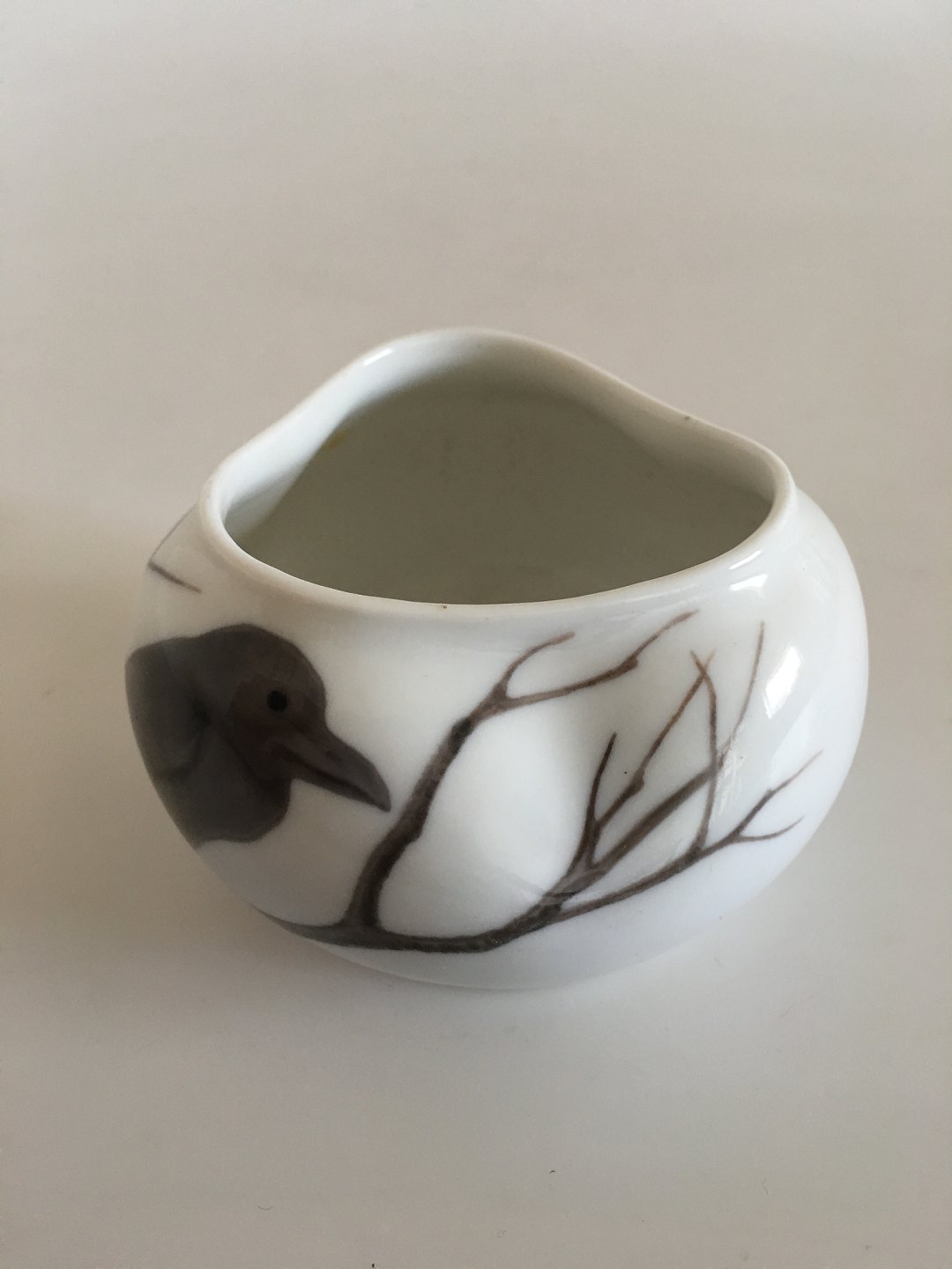 Royal Copenhagen Art Nouveau Skål / Vase No 472/172. Hvidlig med Ravne Motiv. 6 cm H. 10 cm Ø. 1. Sortering. I pæn hel stand.