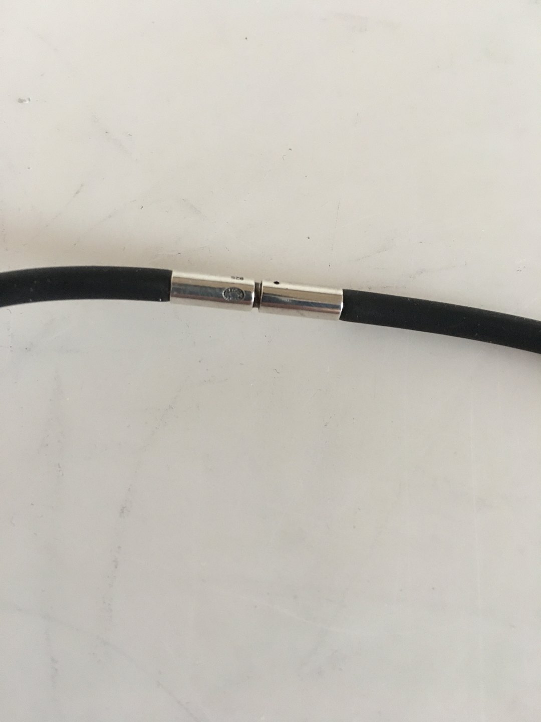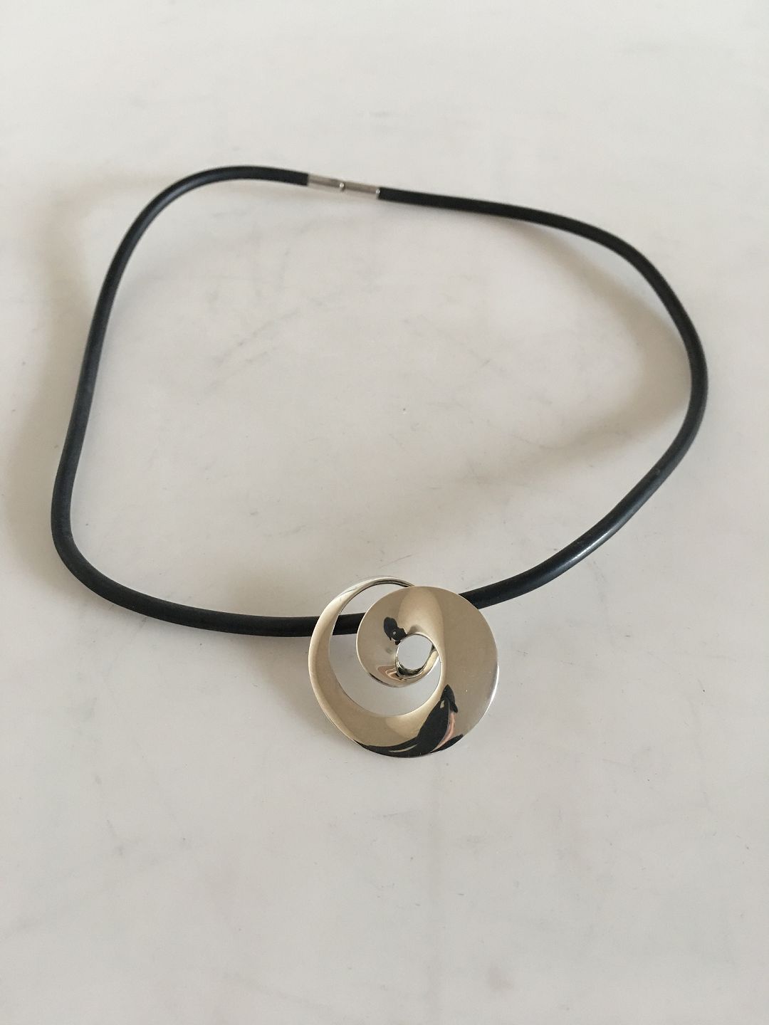 Georg Jensen Sterling Sølv Torun Continuity Vedhæng No 2004 påsat Kæde af sort gummi materiale. Kæden er 44.5 cm L. Vedhæng 3 cm Ø. Vejer 11 Gram.
