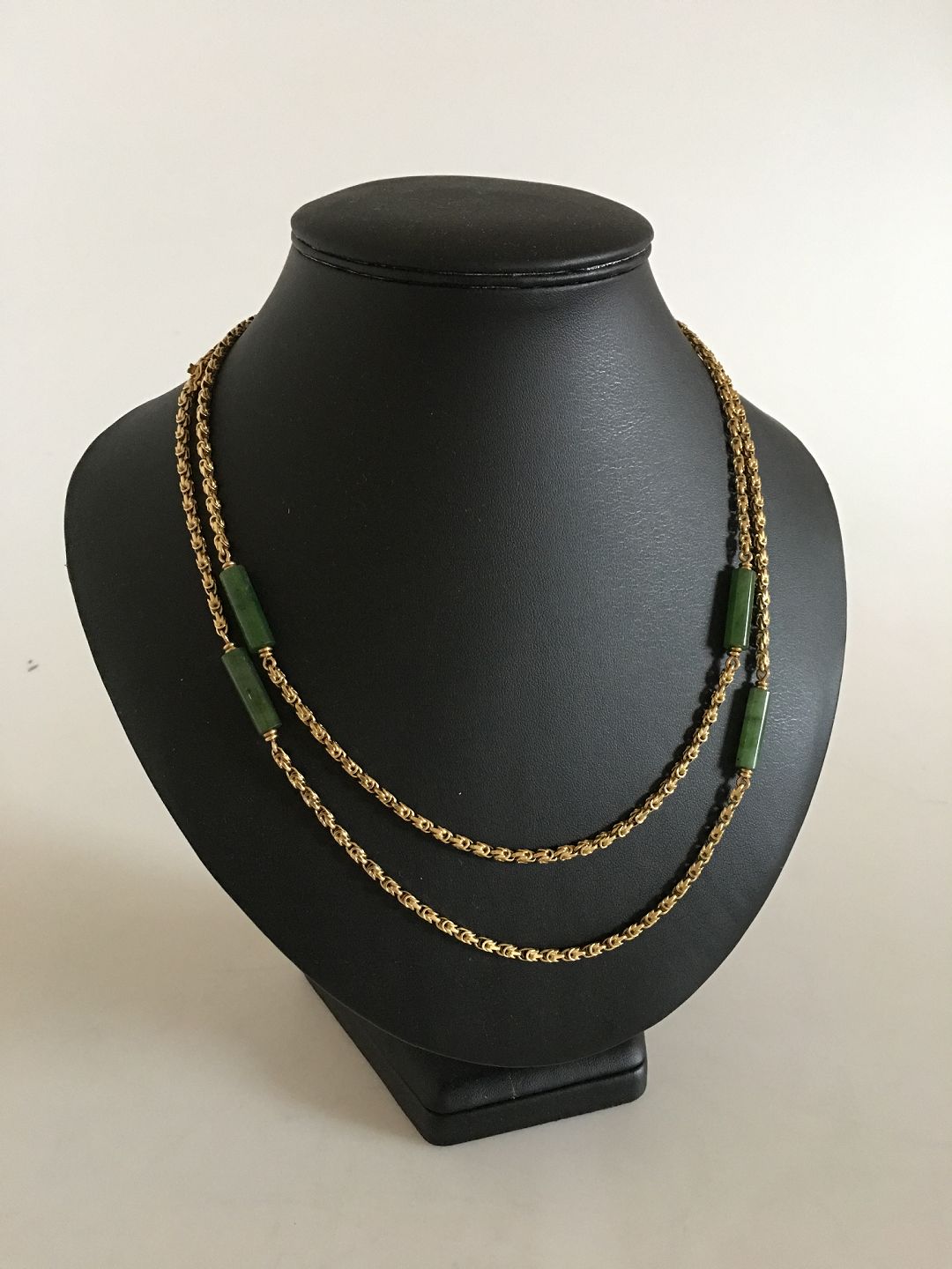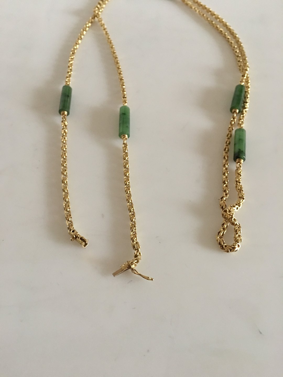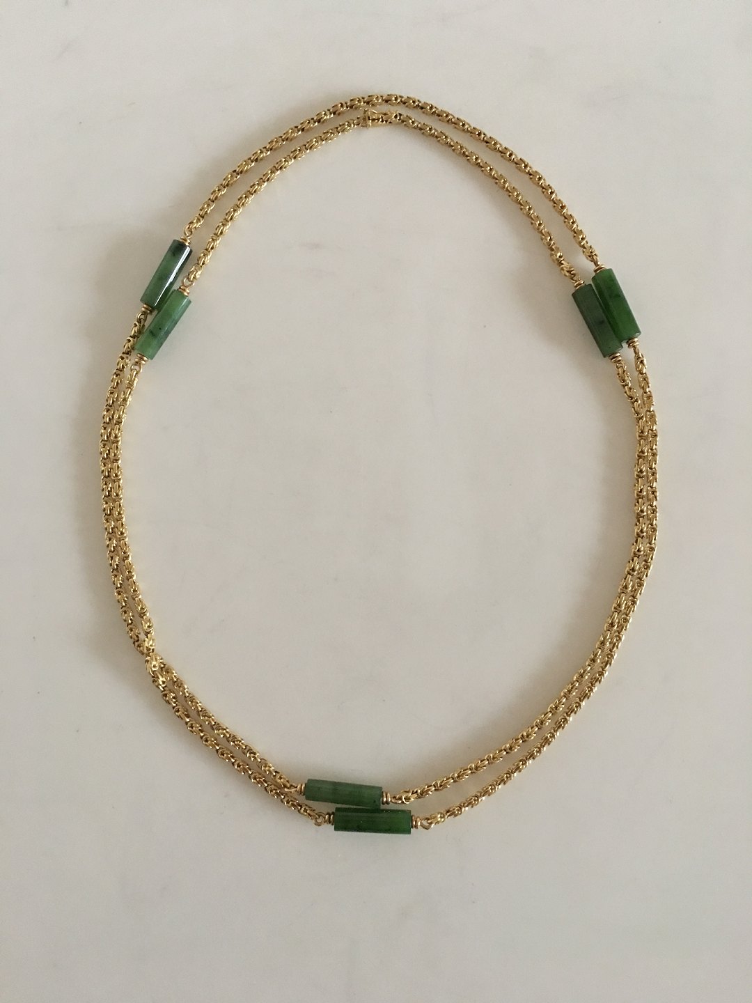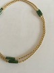 Georg Jensen 18K Guld Collier / Halskæde med Prydet med 6 stykker Grøn Jadesten. 108 cm L. Vejer 63 gram. Fra 1945-1951 og mærket med Georg Jensen & Wendel mærke.