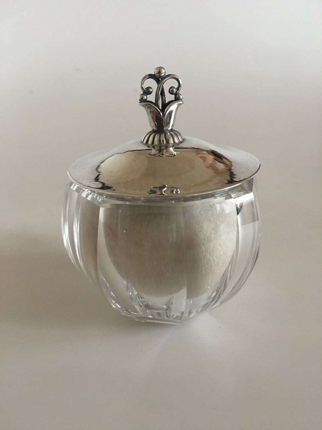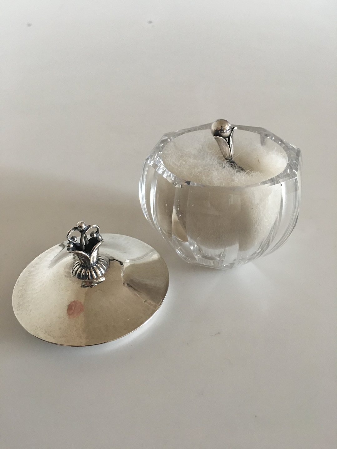 Georg Jensen Body Powder Puff No 172 in Crystal Jar with Sterling Silver Lid No 172. With arly 1920s Georg Jensen Silver Marks. The Glass and lid are in perfect condition. The powder puff looks nice, age considered. The glass measures 5.5 cm H (2 11/64") and 7 cm dia (2 3/4"). The silver pieces weighs 54 grams (1.90 oz)